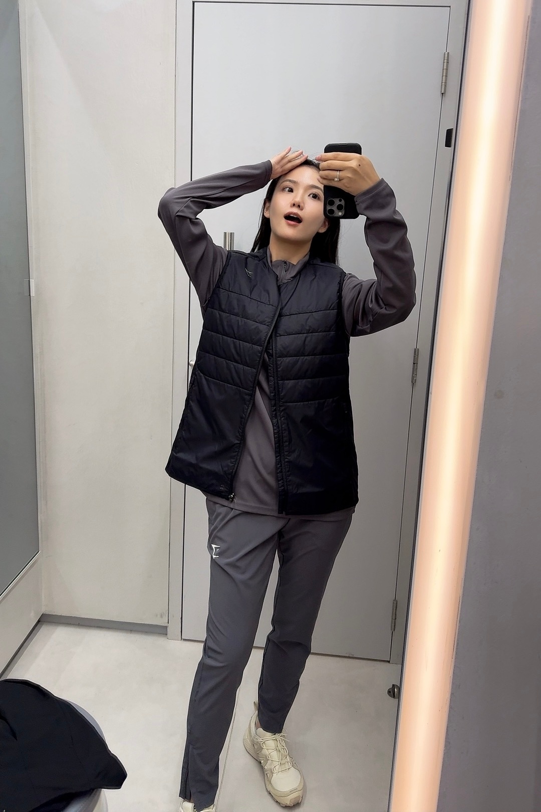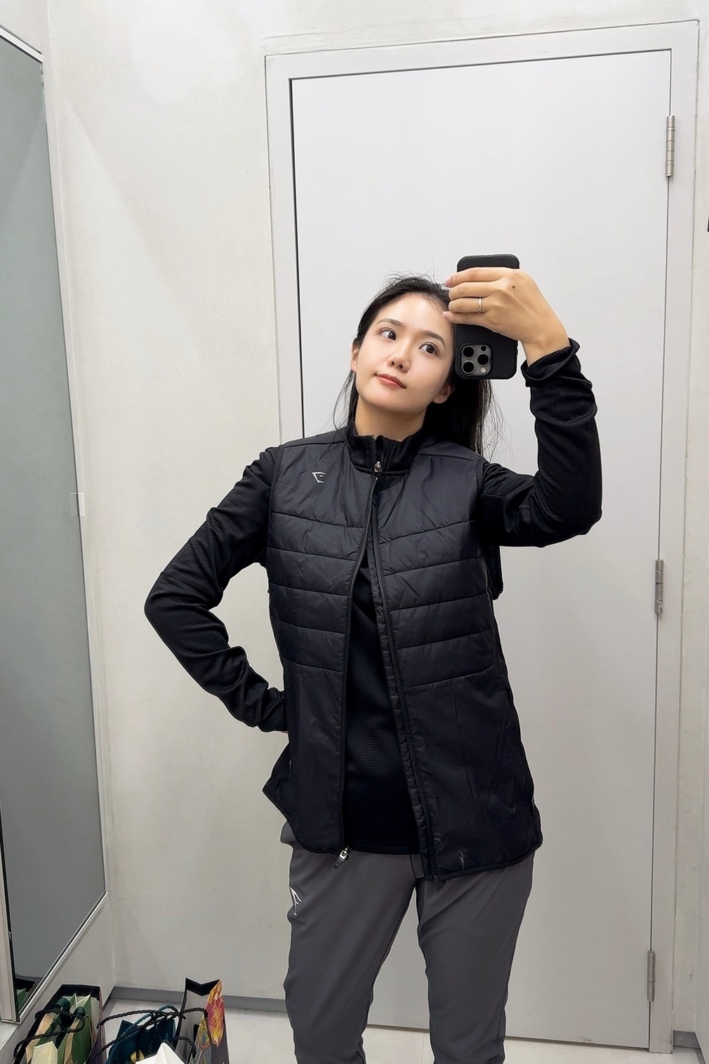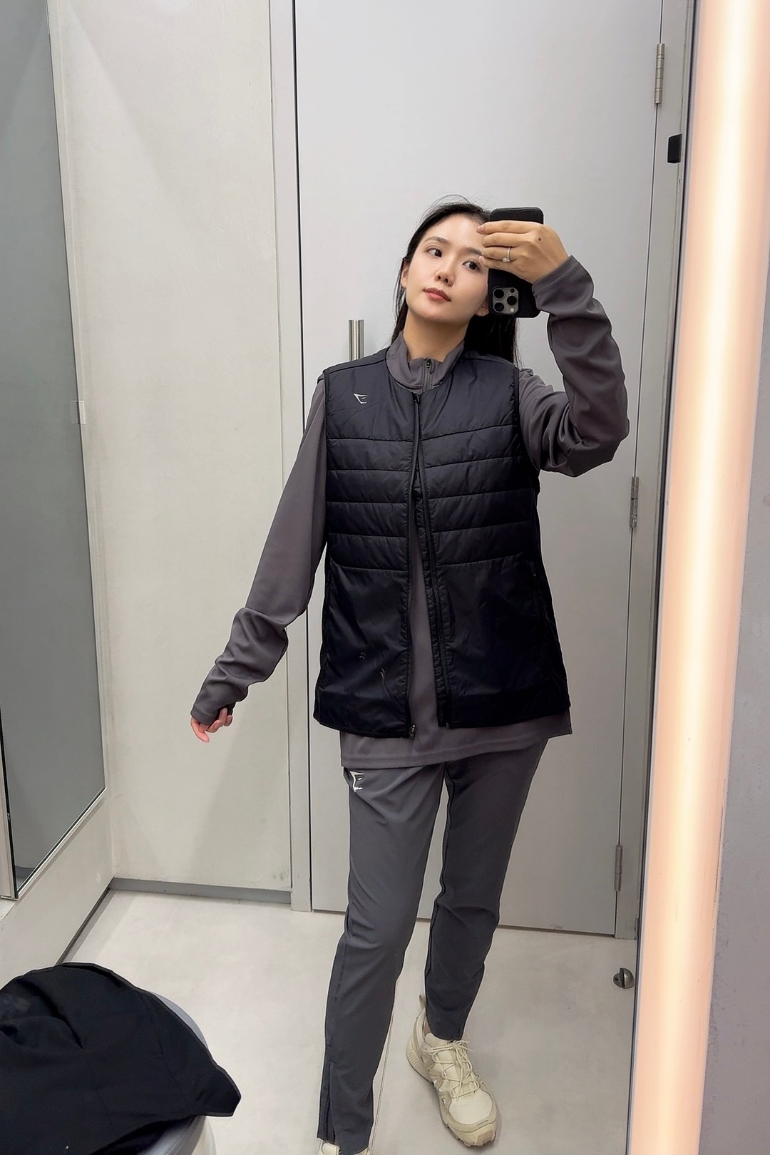 爱惨了这家秋冬的运动服,但是灰色上衣没有s码了,试了下其它黑色也不错,整了一套后但还是钟爱灰色心有不甘