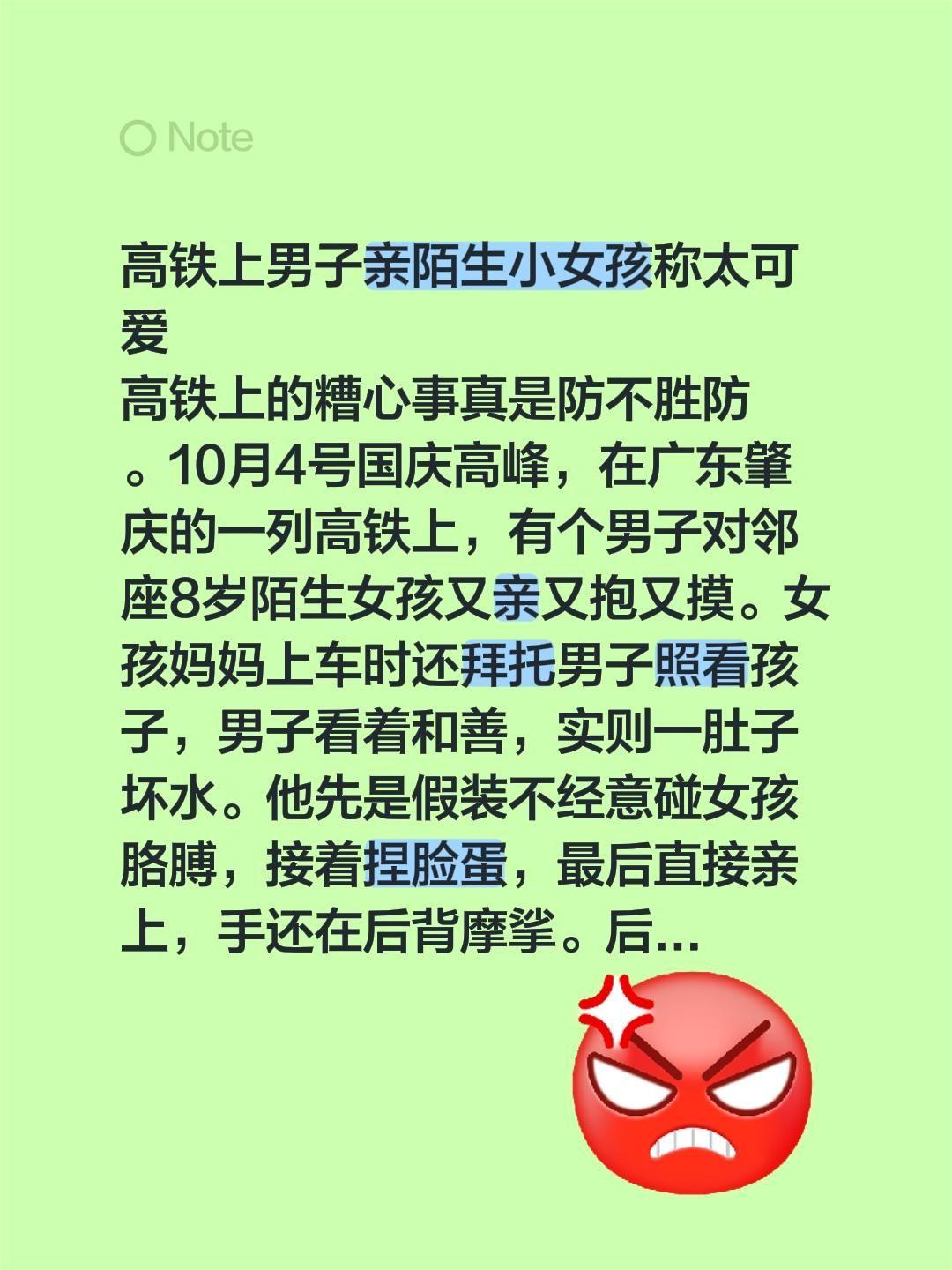 高铁上男子亲陌生小女孩称太可爱 高铁上的糟心事真是防不胜防。10月4号国庆高峰,在广东肇庆的一列高铁上,有个男子对邻座8岁陌生女孩又亲又抱又摸。女孩妈妈上车时还拜托男子照看孩子,男子看着和善,实则一肚子坏水。他先是假装不经意碰女孩胳膊,接着捏脸蛋,最后直接亲上,手还在后背摩挲。后排大爷一开始还以为是父女,没多嘴。女孩妈妈偶然转头看到这一幕,当时就怒了。女孩被吓得僵在座位上。男子狡辩说女孩可爱,这哪是什么可爱,分明就是猥亵,真希望法律能严惩这种人!