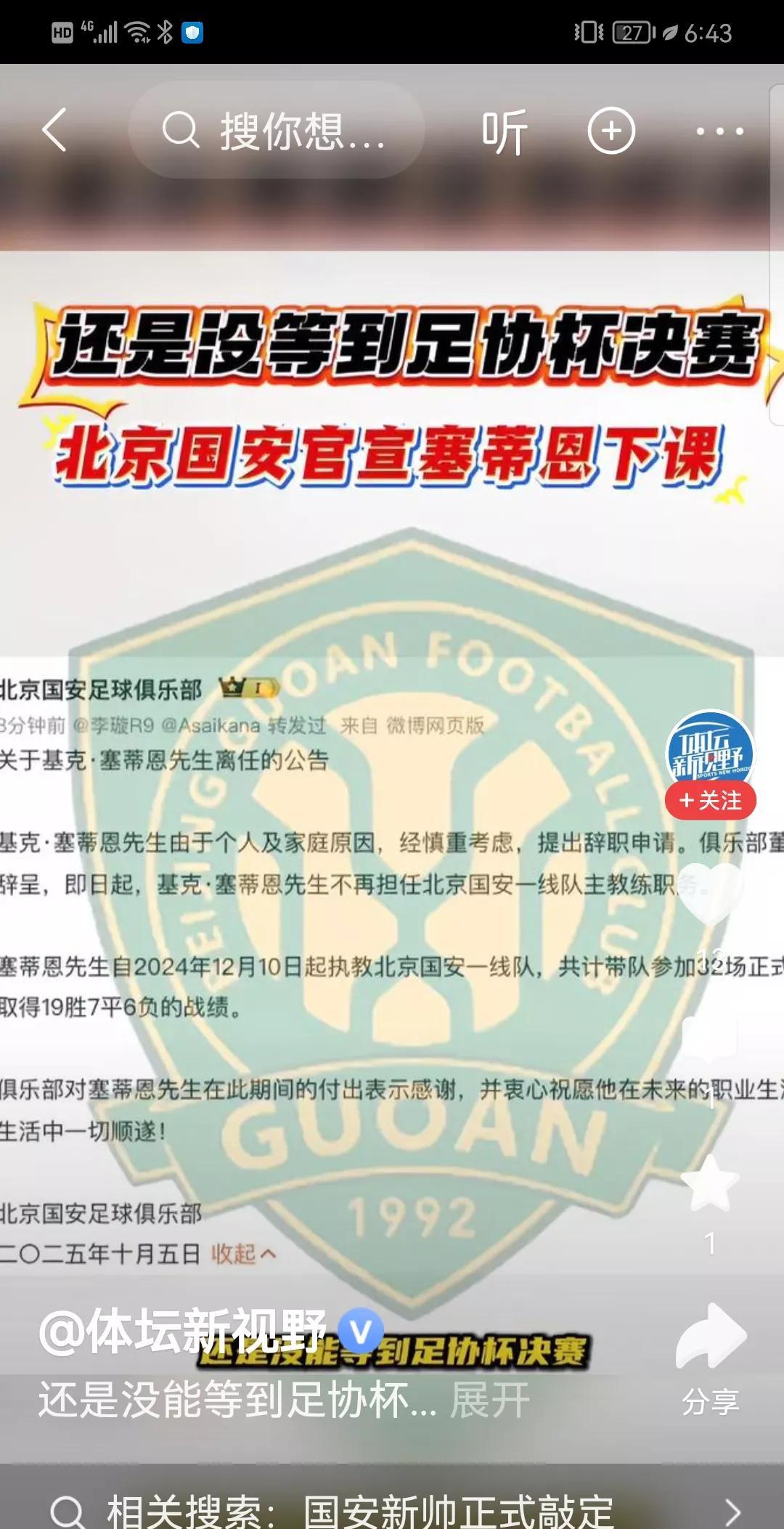 又是一名世界名帅因为水土不服被下课 下课理由很我们 这是北京国安俱乐部官宣的,球队主教练西班牙人塞蒂恩从北京国安辞职了:中秋节前一晚,带过梅西的名帅塞蒂恩因“个人及家庭原因”从北京国安辞职。 这就是中国足球的不专业,公布的理由永远与实际不符,不说带队成绩不行、没有达到球队要求,而是说一种人家根本不存在的理由,“个人和家庭原因”。 落寞的塞蒂恩一个人走了,拉着来时的行李箱,背着来时的背肩包,没人去送送,球迷也很绝情。 他初到国安时可不是这番模样,曾让球队高居半程榜首,后却高开低走,风采不再。 据说最让俱乐部不爽的是客场挑战亚冠二级赛对手澳大利亚麦克阿瑟时没有贯彻俱乐部全力出击的精神,最后0-3大败。 塞蒂恩的经历是很多名帅在中国执教的缩影,他们常因不了解情况在中超自以为是,甚至倔犟地与俱乐部对着干,下课也是早晚的事。 #中超# #北京国安[超话]# #塞蒂恩# #国安主帅# #青岛身边事# #北京身边事#
