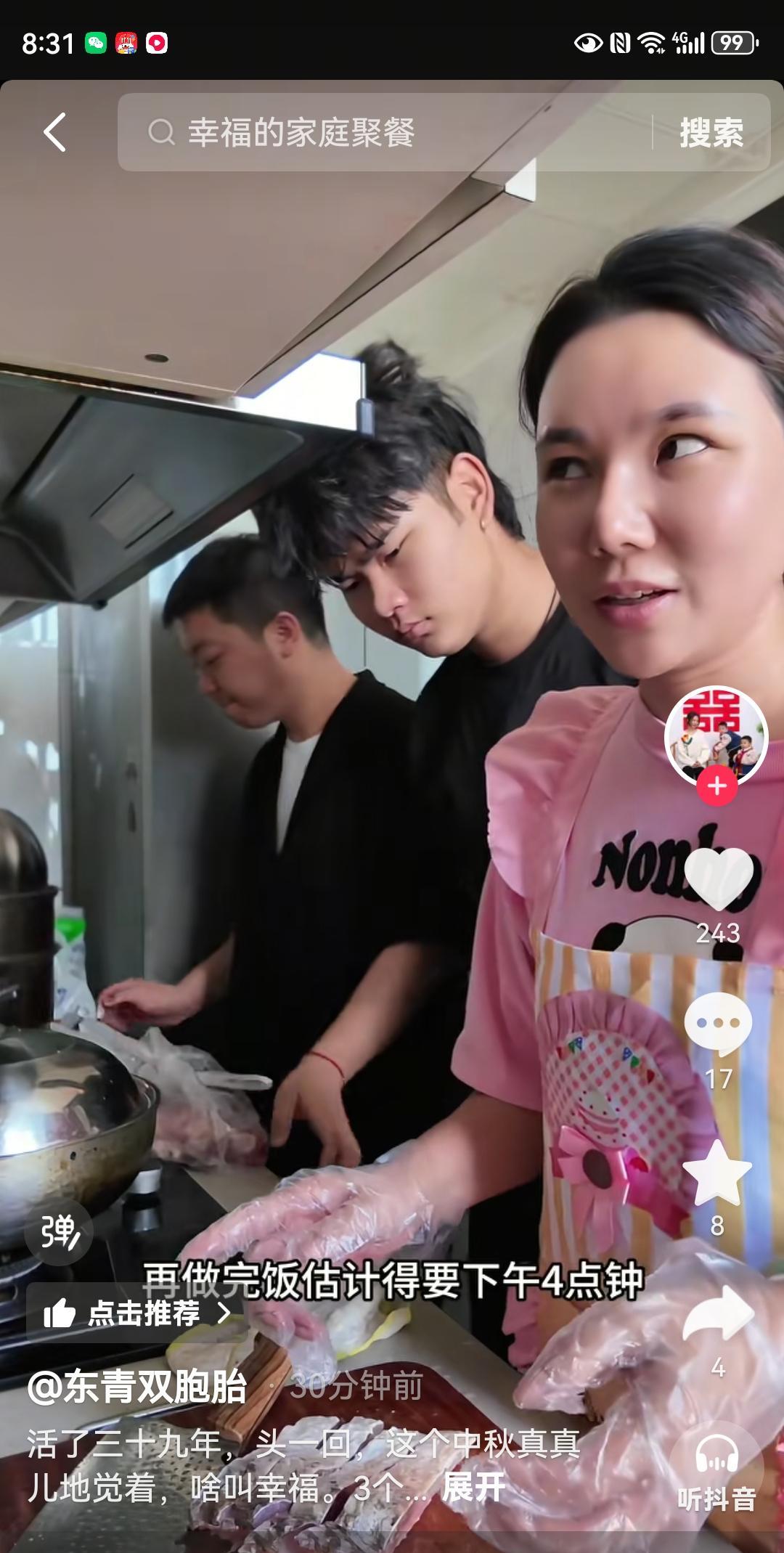 中秋节,二姐家里大团圆。 二姐以为家里就他们一小家五口人过节,结果瑞哥告诉她老爸已经回来了,她不知道?真的假的哦!于是提议叫上哥嫂两家人聚一下吃个饭。两口子带着大儿子去菜市场大采购 ,三人分工合作,一人负责几个,几个小时搞了十来个菜。除了婆婆和豆豆,一家人过了个热闹又圆满的中秋。 李子昂到底还是又回到二姐家了,还是睡的四周挂满二姐衣服的房间,房间小床铺也小。可能就是两米多一点儿的开间,躺床上脚那边就剩十来公分了,周围又挂满衣服,空间狭窄感觉应该跟窒息。但还是比在舅舅家那样流浪混日子要好,不知接下来是安排他去读书还是学手艺。 话说,这菜单应该是出自大学生之手,他刚出狱还经常练字,临摹字帖,这字漂亮吗?