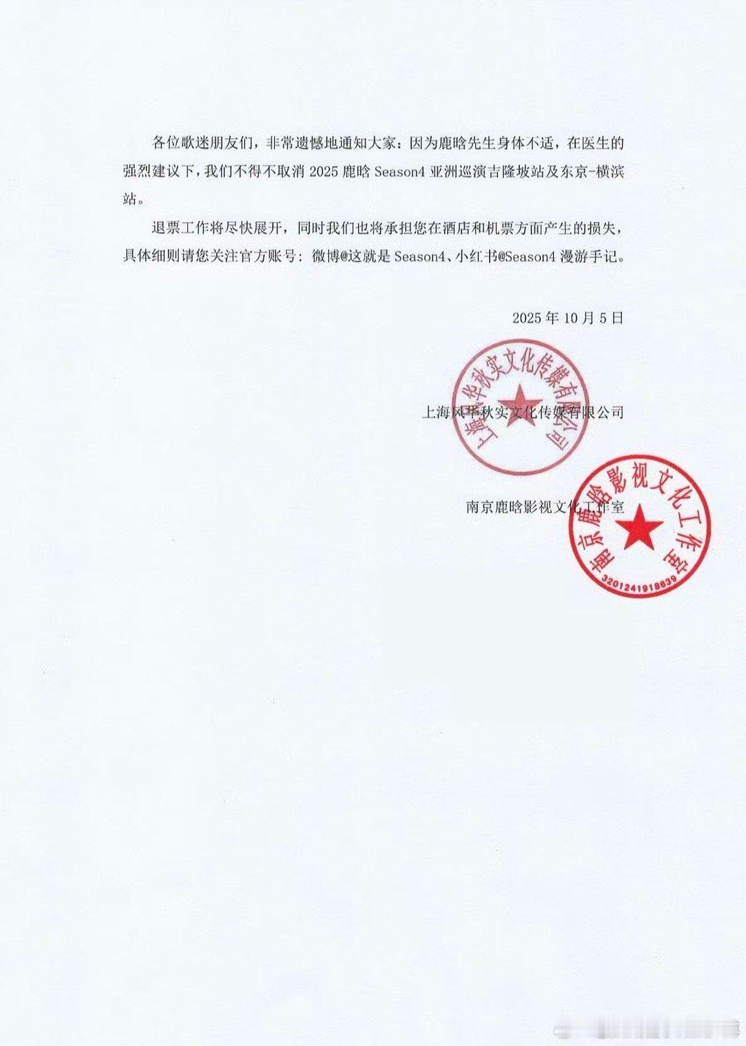 鹿晗方将承担机票和酒店产生的损失“2025鹿晗Season4亚洲巡演”官方发布公告,称2025鹿晗Season4亚洲巡演吉隆坡站、东京-横滨站演出取消。相关退票及补供事宜将尽快展开,也将承担在酒店和机票方面产生的损失。公告显示,鹿晗先生身体不适,在医生的强烈建议下,不得不取消。机票+住宿,这种行为已经非常有担当了!