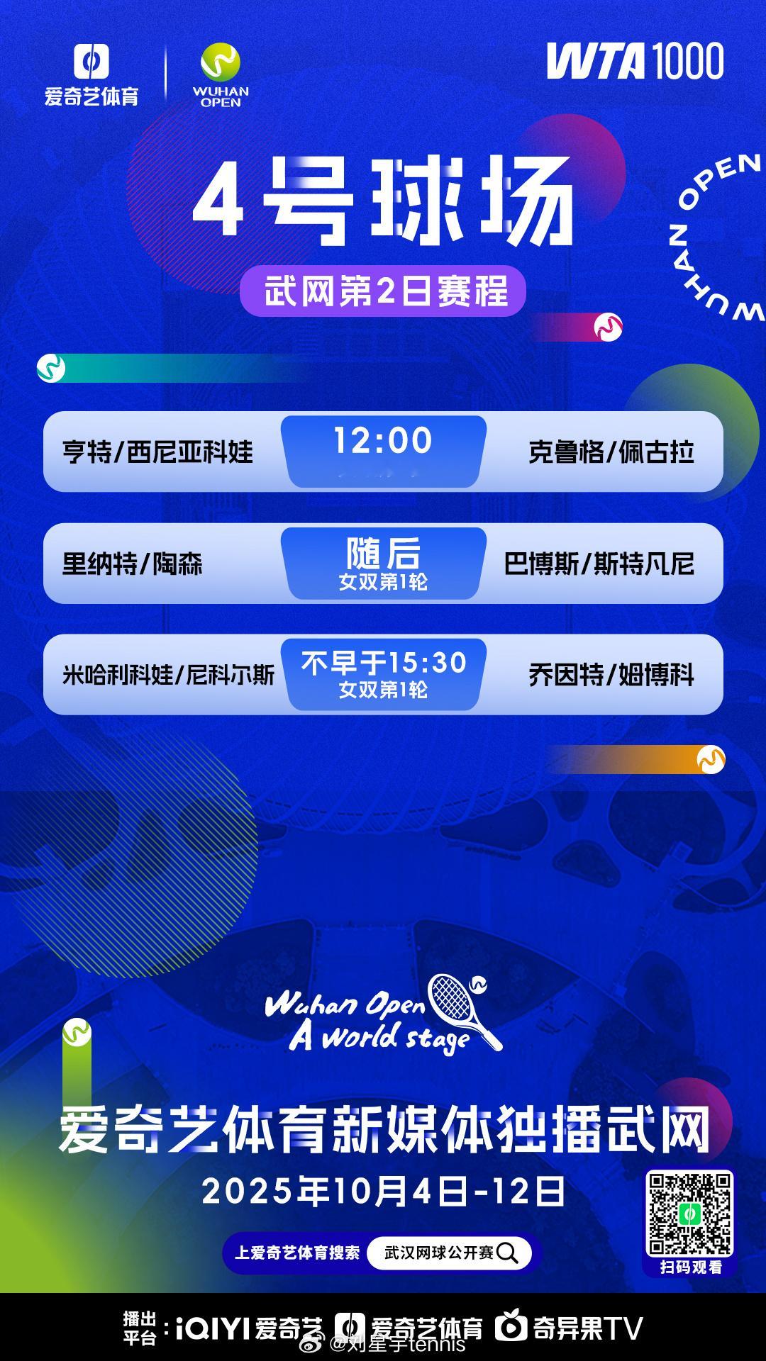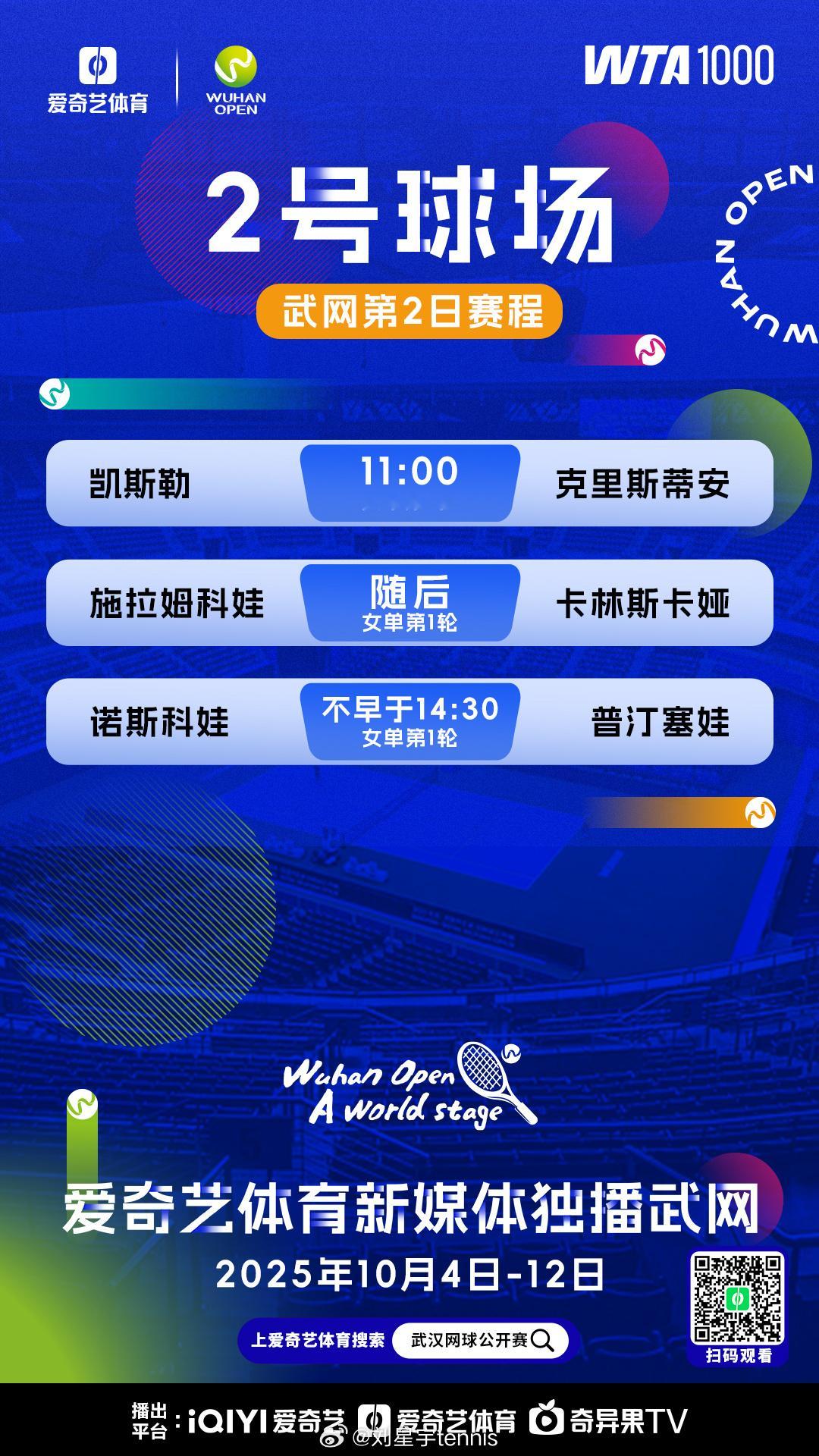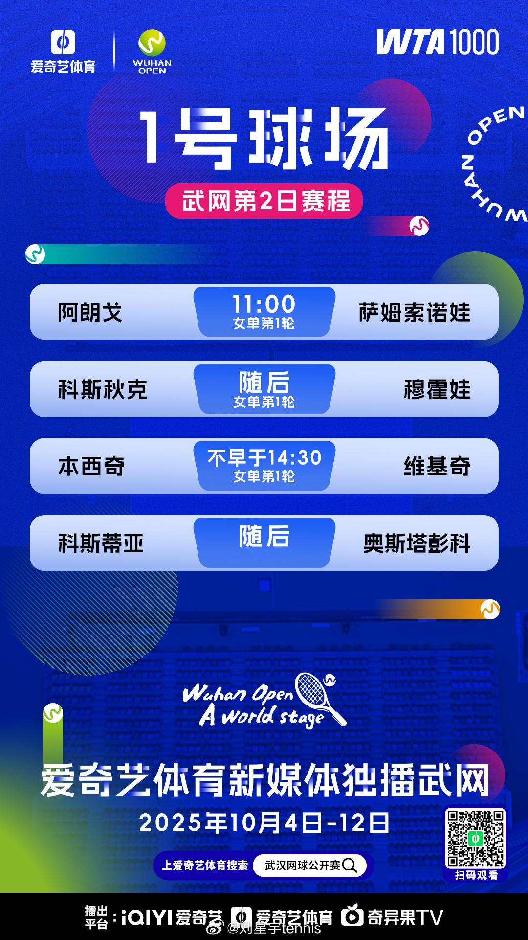 武汉网球公开赛 今日赛程,我会在解说今天日场的三场比赛。武汉的签表规模不大,但是其实特别不好打,从第一轮开始就是强强对决,每一场都足够精彩。