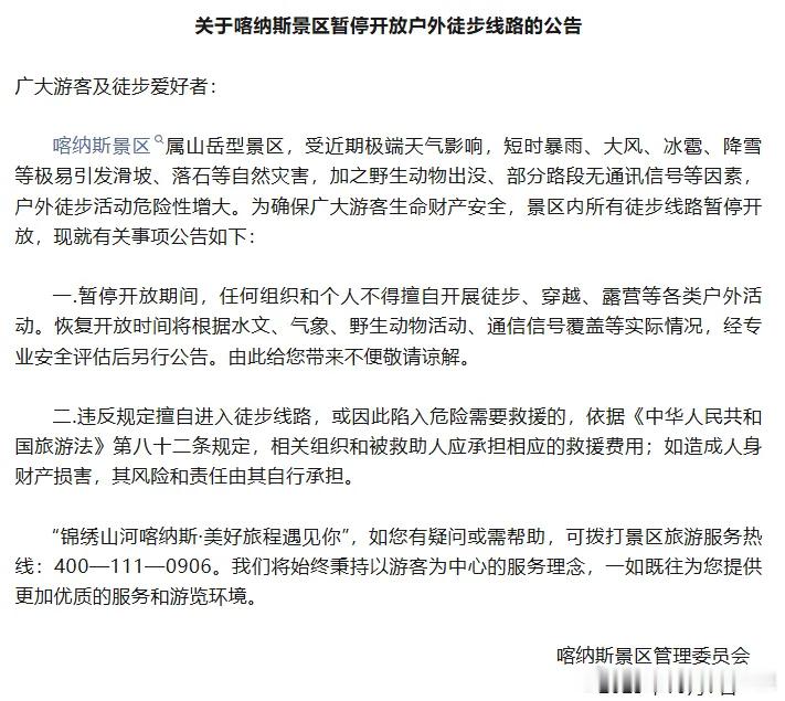 7日上午,喀纳斯景区管理委员会发布《关于喀纳斯景区暂停开放户外徒步线路的公告》,提醒广大游客及徒步爱好者,景区暂停开放期间,任何组织和个人不得擅自开展徒步、穿越、露营等各类户外活动。违反规定擅自进入徒步线路,或因此陷入危险需要救援的,依据《中华人民共和国旅游法》第八十二条规定,相关组织和被救助人应承担相应的救援费用;如造成人身财产损害,其风险和责任由其自行承担。