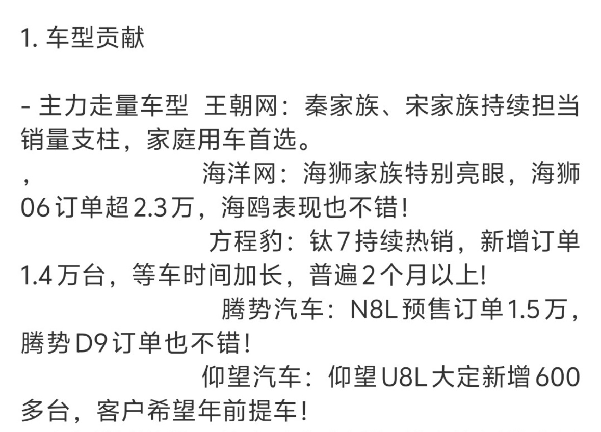 海狮06超2.3万台,钛7达1.4万台,腾势N8L预定数据也不错。最炸裂的,仰望U8L新增大定超600台,一天100台的节奏。