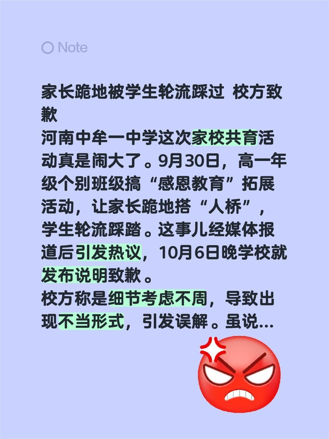 家长跪地被学生轮流踩过 校方致歉 河南中牟一中学这次家校共育活动真是闹大了。9月30日,高一年级个别班级搞“感恩教育”拓展活动,让家长跪地搭“人桥”,学生轮流踩踏。这事儿经媒体报道后引发热议,10月6日晚学校就发布说明致歉。 校方称是细节考虑不周,导致出现不当形式,引发误解。虽说取得了家长同意,但这形式也太离谱了。感恩教育本是好事,可这么个搞法实在让人难以接受。希望学校以后真能注意方式方法,好好优化育人方式,别再整出这种雷人的活动了。
