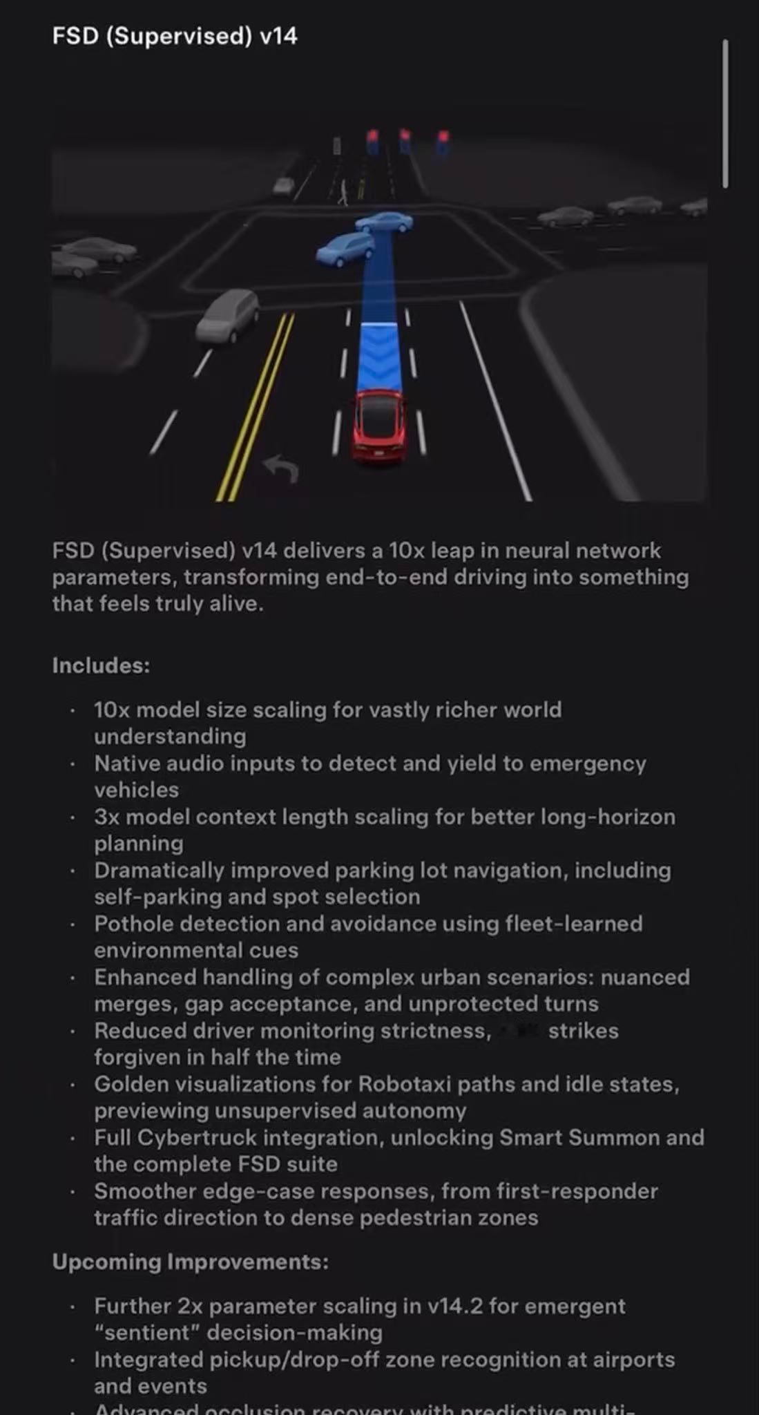 FSD(有监督)v14 在神经网络参数上实现了 10 倍的跃升,将端到端驾驶转变为一种真正 “鲜活” 的体验。