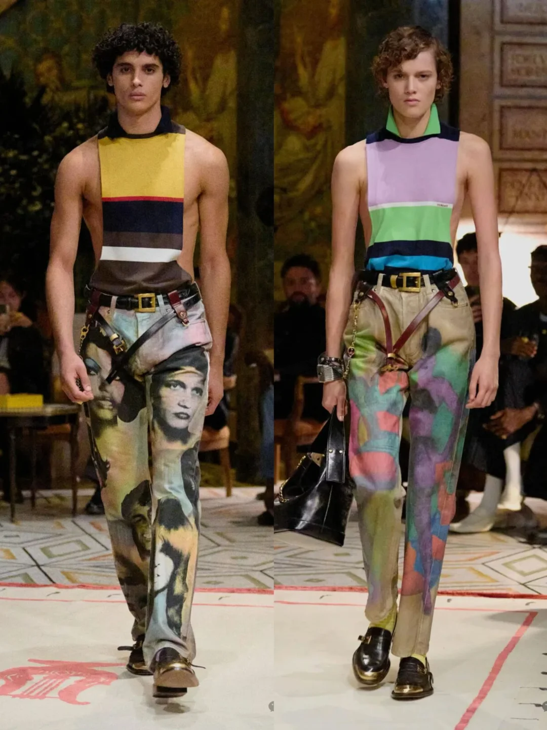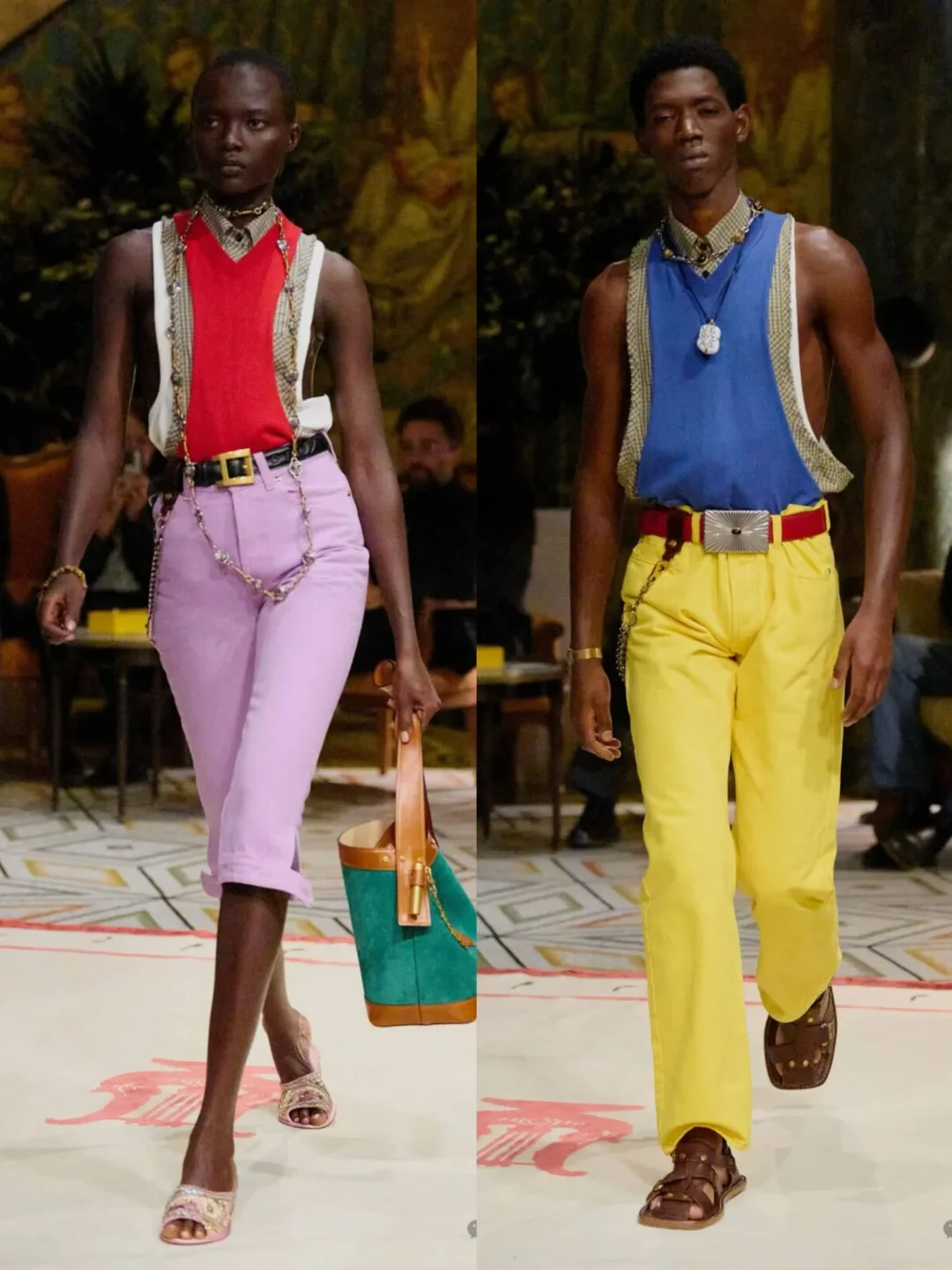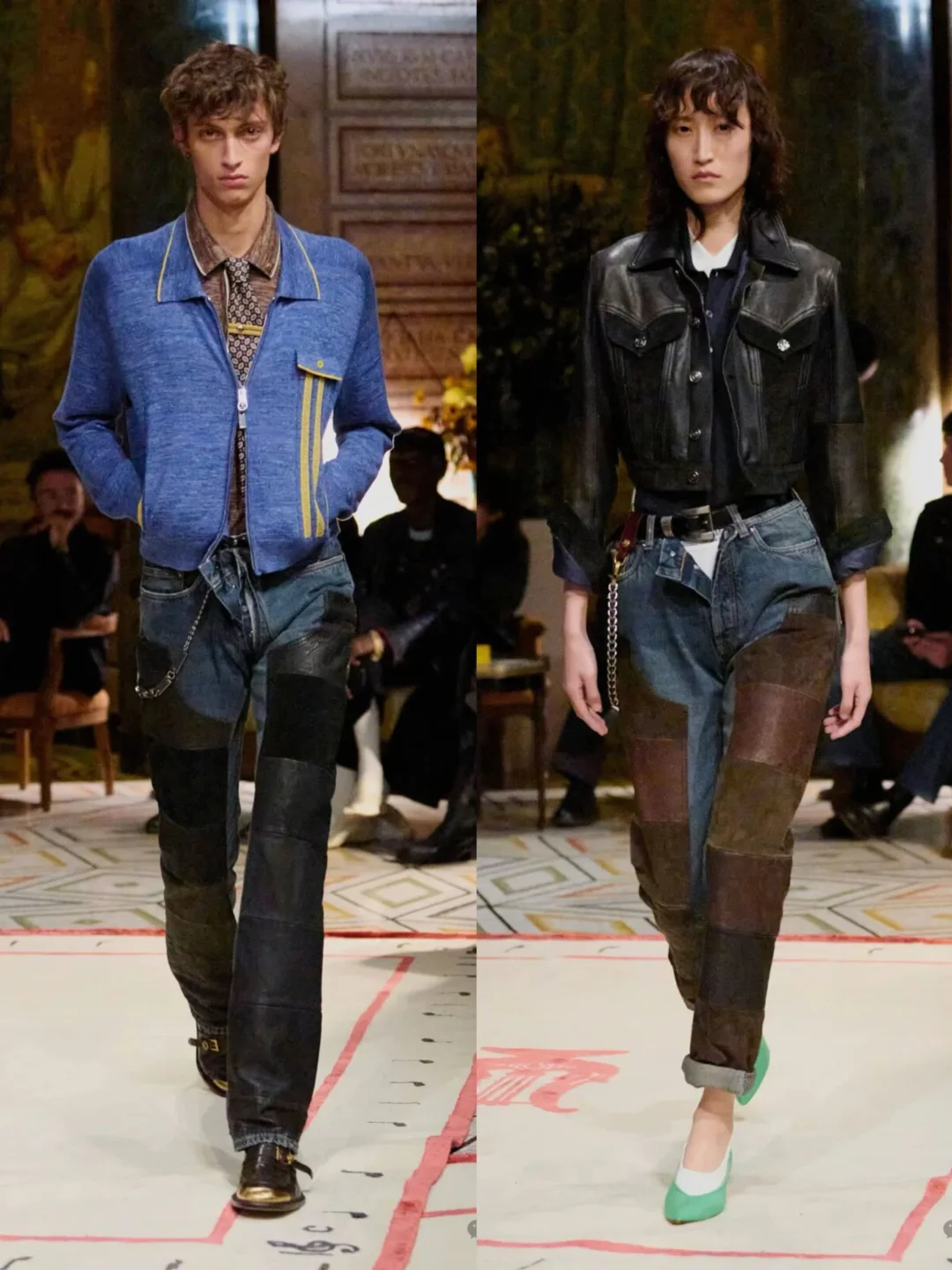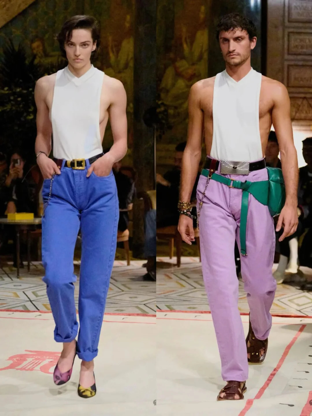系列以牛仔裤、T恤、肌肉背心和夹克为主角,打破范思哲过往的礼服传统,强调“松弛奢侈”的街头美学,将高饱和色调与复古元素融入基础款设计。呈现出自由随性感……素材来源于网络若有侵权请联系删除