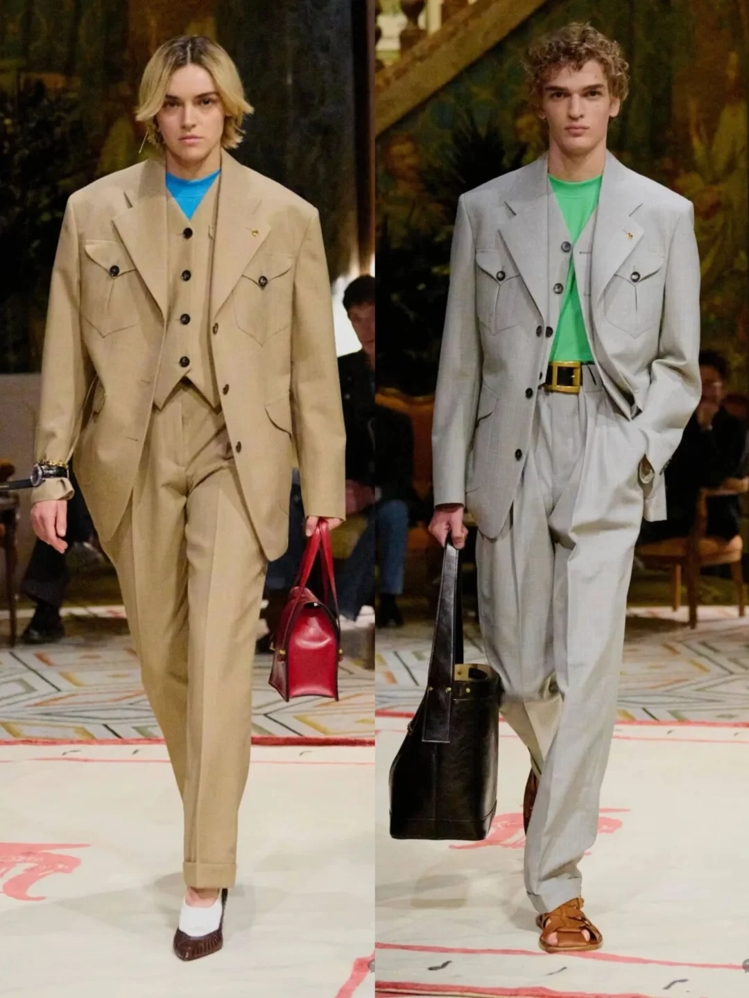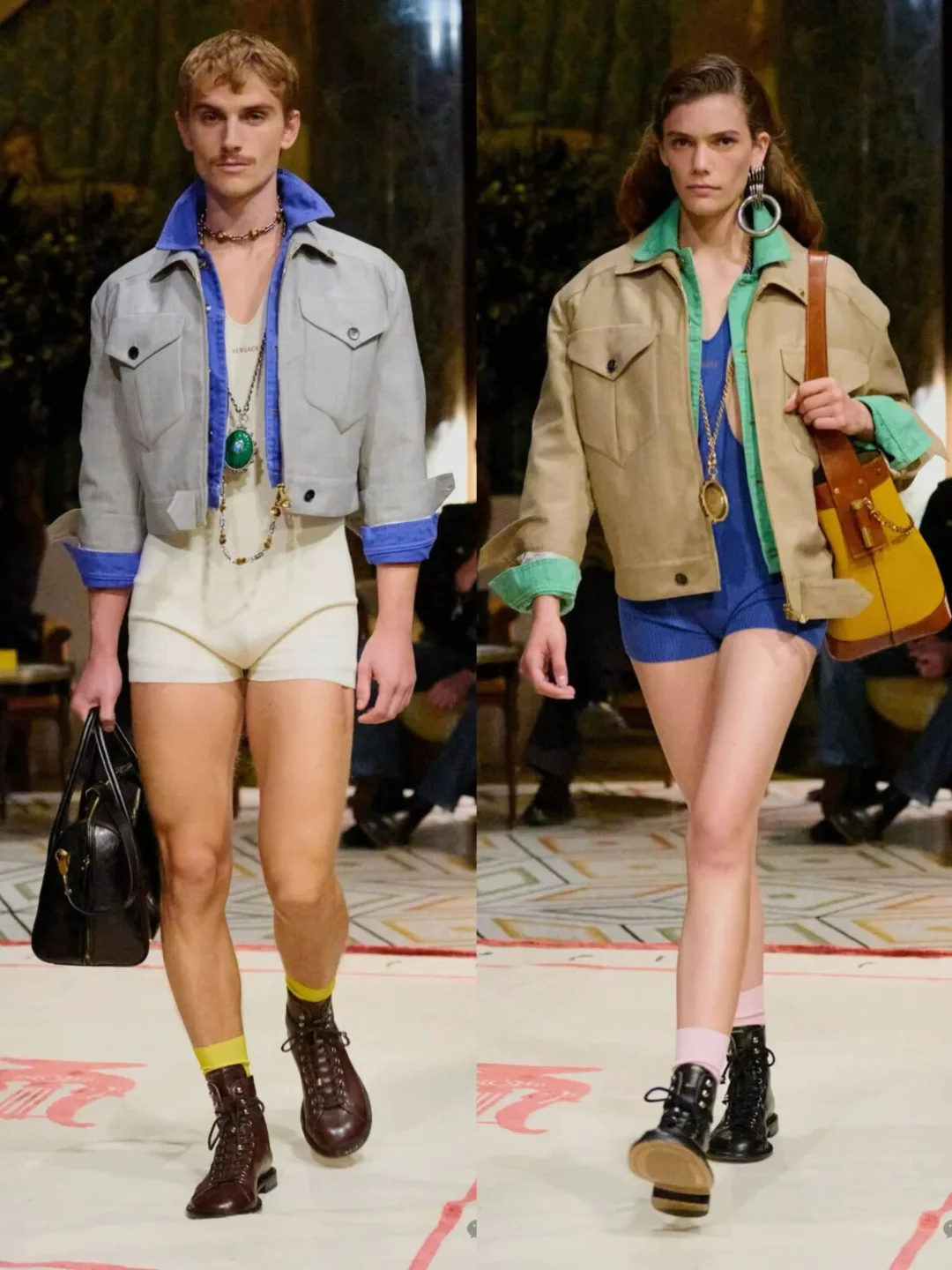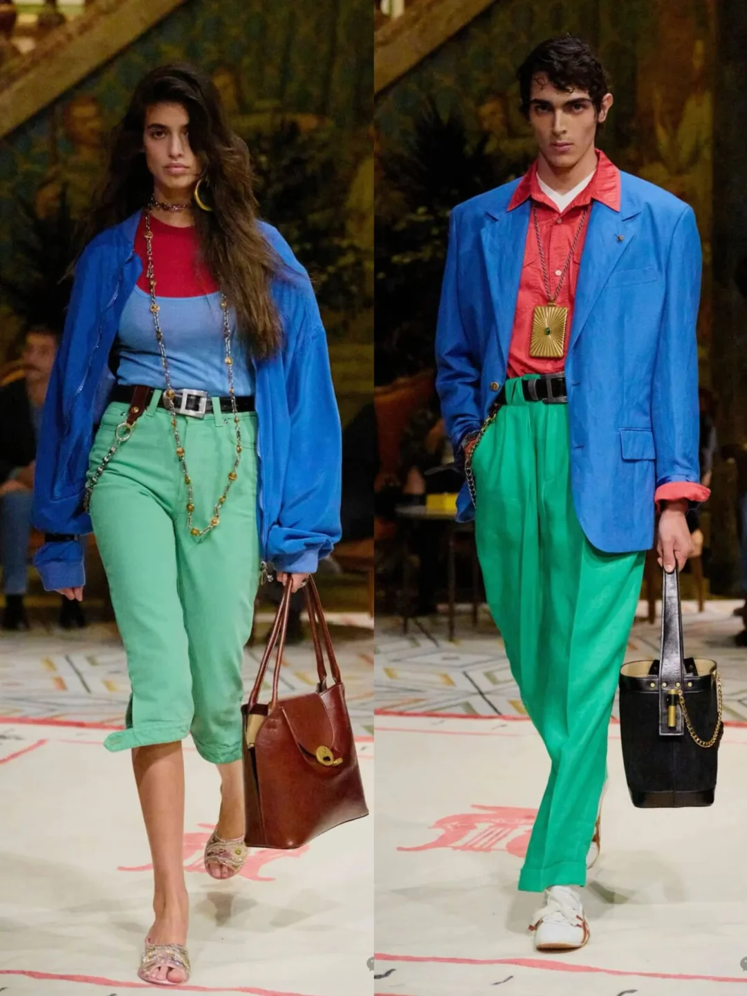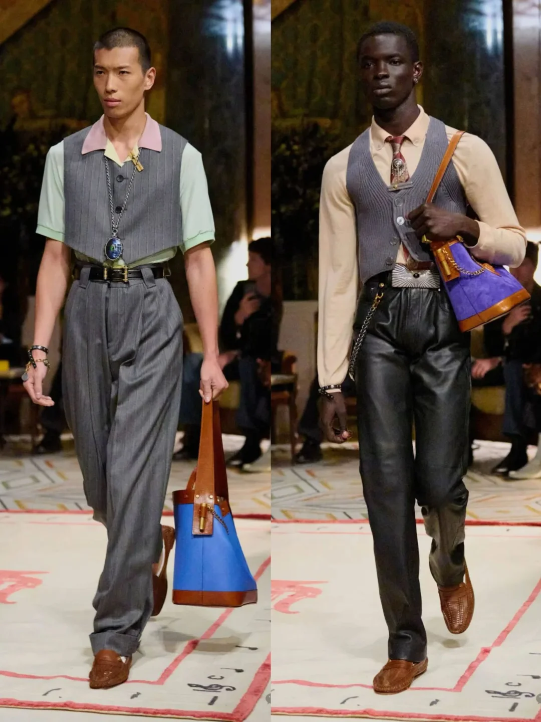 系列以牛仔裤、T恤、肌肉背心和夹克为主角,打破范思哲过往的礼服传统,强调“松弛奢侈”的街头美学,将高饱和色调与复古元素融入基础款设计。呈现出自由随性感……素材来源于网络若有侵权请联系删除