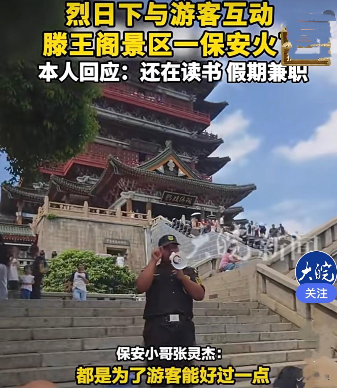 靠谱的“保安”小哥 假日期间,江西滕王阁景区烈日炎炎,人山人海,为了安全,游客分批进入阁内,等待进阁的游客不得不在烈日下等待…… 暖心的一幕出现了:一保安小伙, 在登阁台阶上用喇叭和游客互动,安抚游客情绪,和游客一起晒太阳…… 保安小哥说,上面的人太多了,安全第一…… 面对火了,小哥说,火的不是我,是滕王阁和江西,我只是所有为这个地方奋斗的工作人员之一,比较幸运被拍下来了…… 小哥还在读大学,假期兼职……