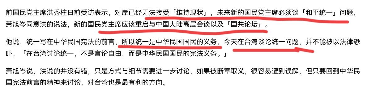 对于国民党主席,洪秀柱点出来一个最为关键性的问题,马英九也表示同意!洪秀柱表示,对岸已经无法接受维持现状,未来新的国民党主席必须谈和平统一问题。而马英九基金会执行长萧旭岑也站出来表示,他同意洪的说法,新的国民党主席应该重启与中国大陆高层会谈以及国共论坛。 萧旭岑表示,统一写在“中华民国宪法”的前言,所以统一是“中华民国”国民的义务,今天在台湾谈论统一问题,并不能被以法律恐吓,在台湾讨论统一,不是言论自由,而是“中华民国”国民的宪法义务,而这对台湾也是最有利的方向。很显然,不管是洪秀柱,还是代表马英九出来发言的萧旭岑都挑明了一个关键性的问题。 那就是在当下重要的时间节点,任何有志于国民党党主席的人必须面对统一问题了,都应该意识到现状是不可维持的。洪秀柱,马英九两个人经常穿梭于台湾和大陆之间,对于两岸局势的判断肯定也更加的敏锐,也更能够捕捉到两岸大气候的变化。这样的表态,某种程度无疑也代表马英九和洪秀柱的倾向。 这个倾向就是谁能够更加积极的面对两岸问题,谁能够为两岸关系破局,到最后面洪秀柱和马英九就越有可能支持谁。事实上,现在六位候选人提到要开启国共论坛,提及要致力于和平统一的可能也只有张亚中。两岸实力对比在变化,中美实力对比也在变化,现状本就在变化之中,不存在一个可以维持的现状。那些自说自话,不面对根本性问题的人,事实上,是拖不下去的!