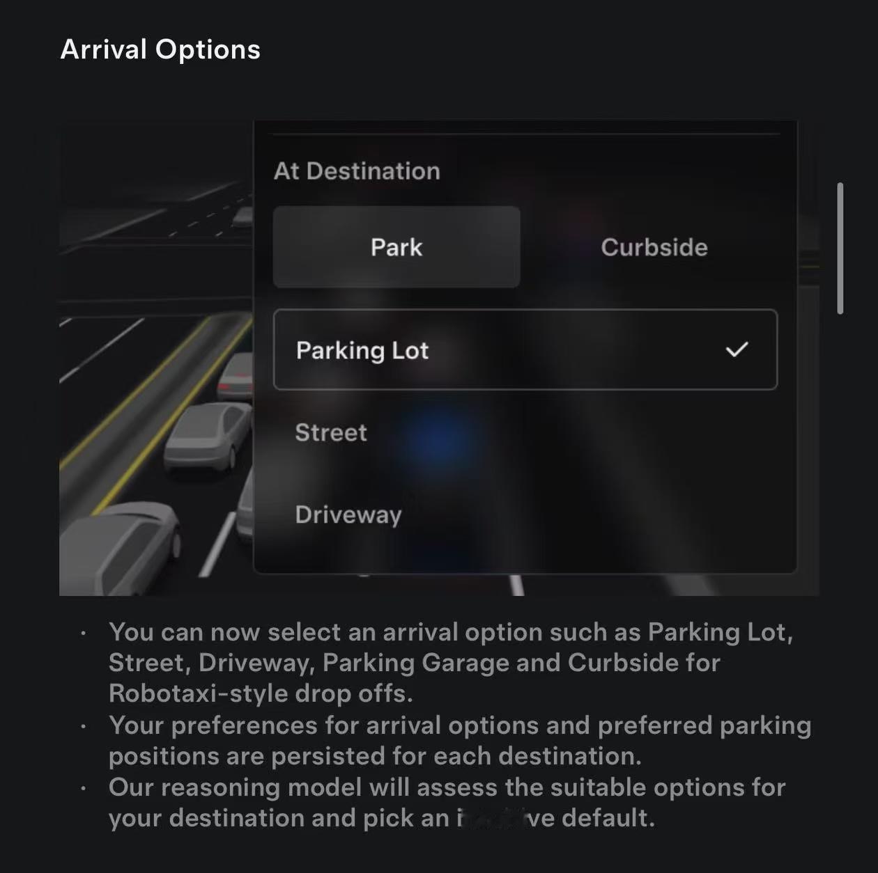 -现在,你可以为 Robotaxi 式的下车选择到达选项,比如停车场(Parking Lot)、街道(Street)、车道(Driveway)、停车库(Parking Garage)和路边(Curbside)