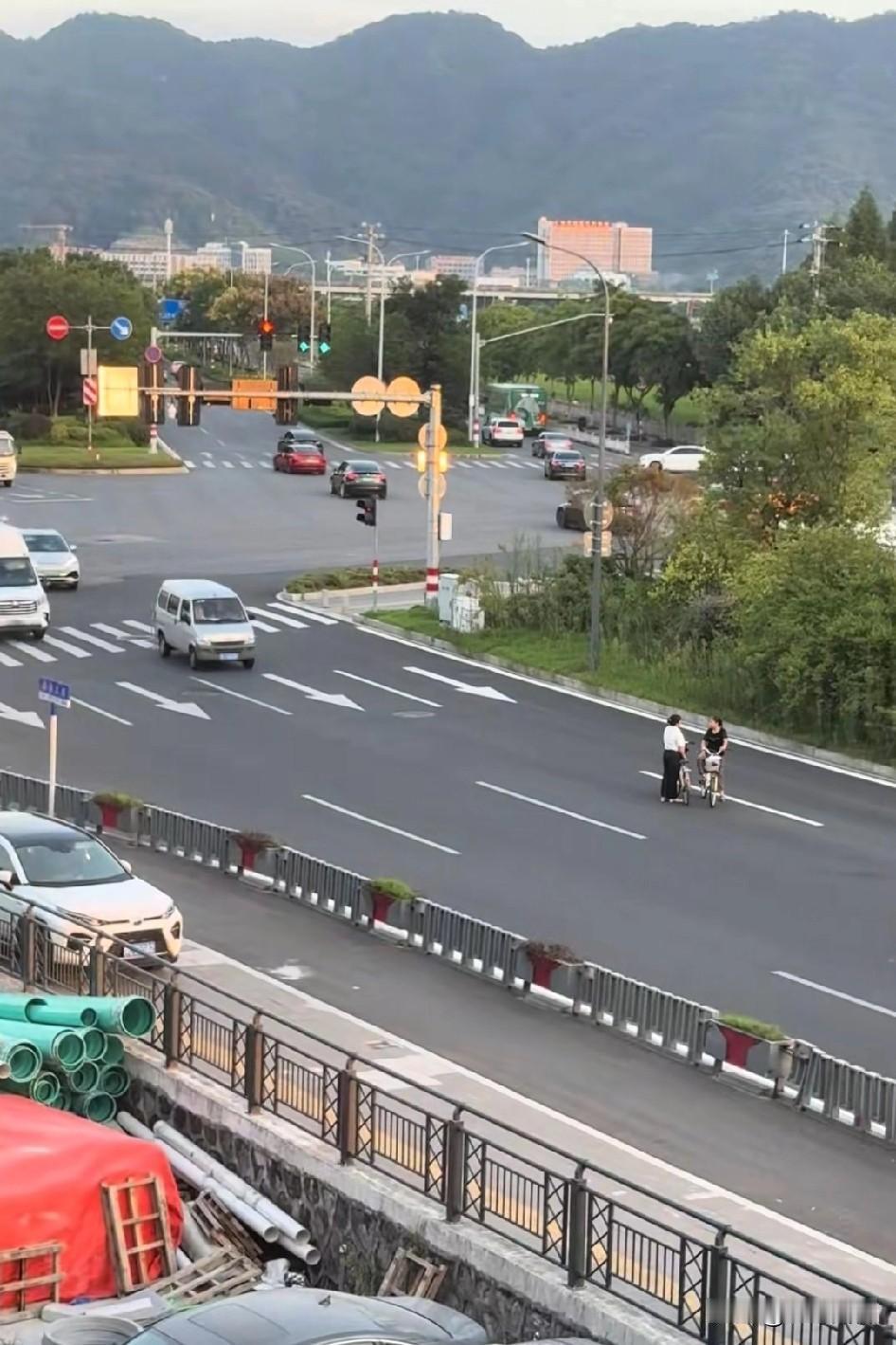 大娘就是大娘,在马路中间,随时随地自行车一跨就聊起来了 真把马路当自己家客厅了,