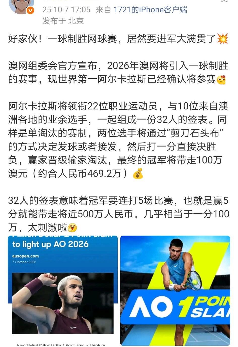 跟美网看齐!澳网也开发出一种新的娱乐方式:一球制胜网球赛。 冠军奖金100万澳元,世界第一阿尔卡拉斯已确定参赛。这种玩法对于那些发球大炮是福音。 美网引入的混双,冠军奖金是100万美元,事实证明美网赌对了。此举吸引了很多眼球和流量。