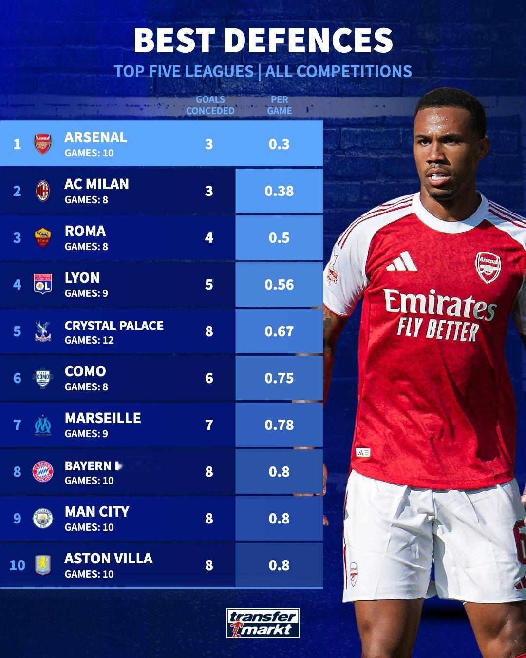 德转统计,阿森纳在本赛季欧洲五大联赛中拥有最好的防守[酷]