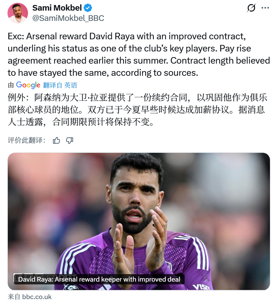 【嘉奖】SamiMokbel:阿森纳为大卫·拉亚提供了一份加薪合同。据消息人士透露,合同期限预计将保持不变。