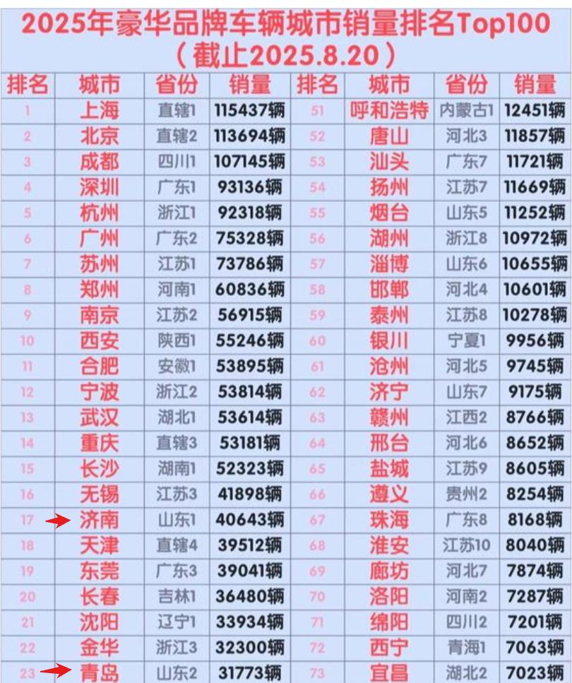 截止8月20日的Top100城市豪车销量,排在山东第一名的济南仅仅列全国第17位,而省内排第二名的青岛则列23位,令人意想不到的是潍坊,取得了全省第三的名次!临沂和潍坊分别排在全省第4和第5名!! 在全国Top100城市里,江苏13太保全部上榜,确实有实力昂!!