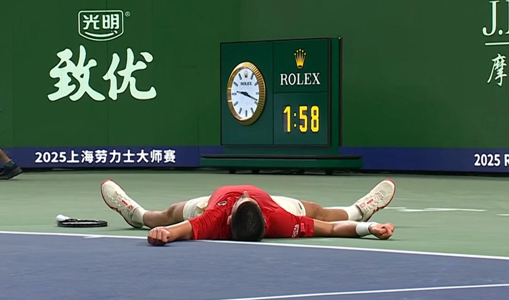 德约盘末被偷鸡,第二盘5-7,被穆纳尔拖进决胜盘[捂嘴哭]已经打趴了……
