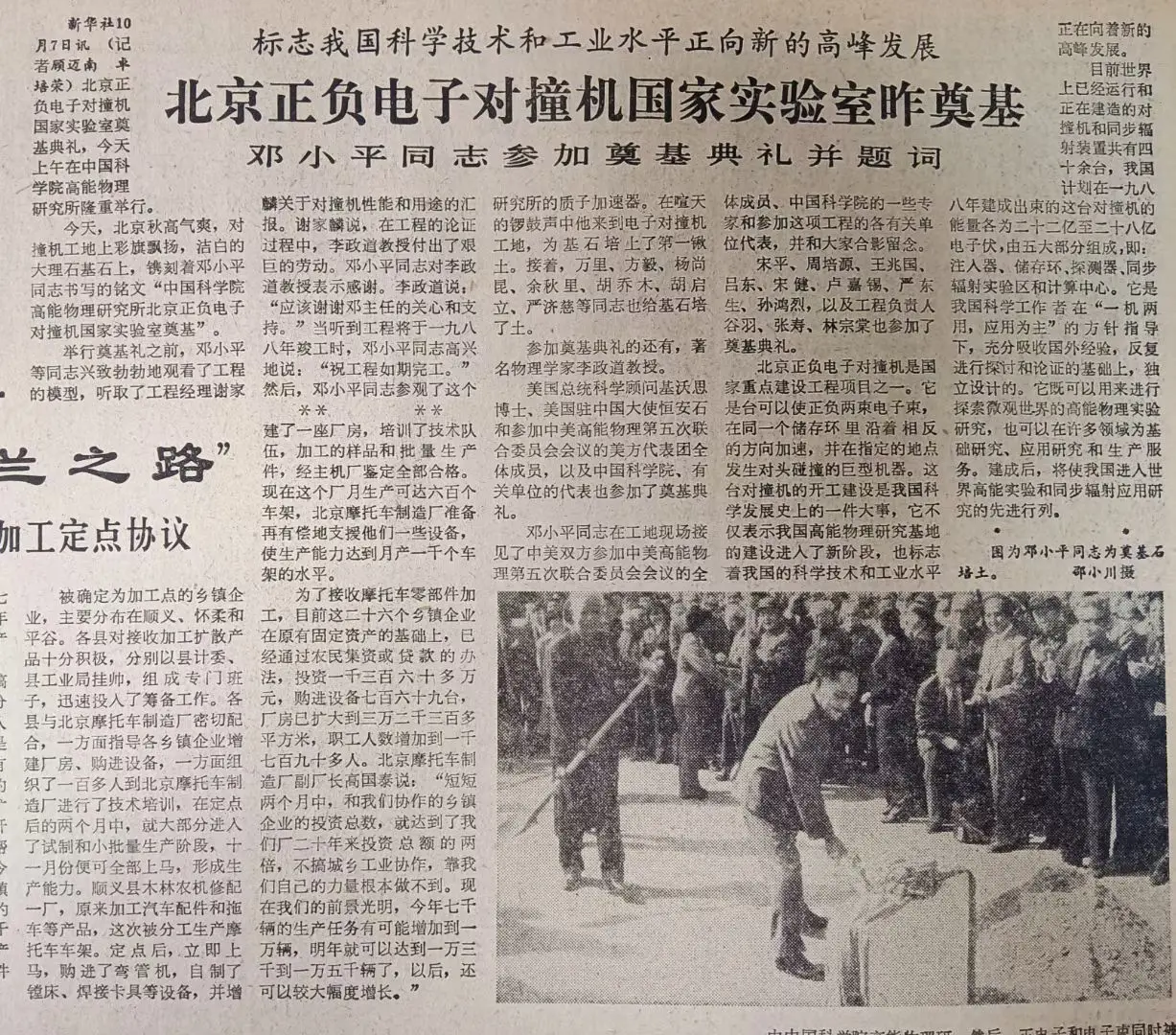 老报上的今天---四十一年前的1984年10月8日《北京日报》头版报道:标志我国科学技术和工业水平正向新高峰发展,北京正负电子对撞机国家实验室昨奠基。邓小平同志参加奠基典礼并题词。