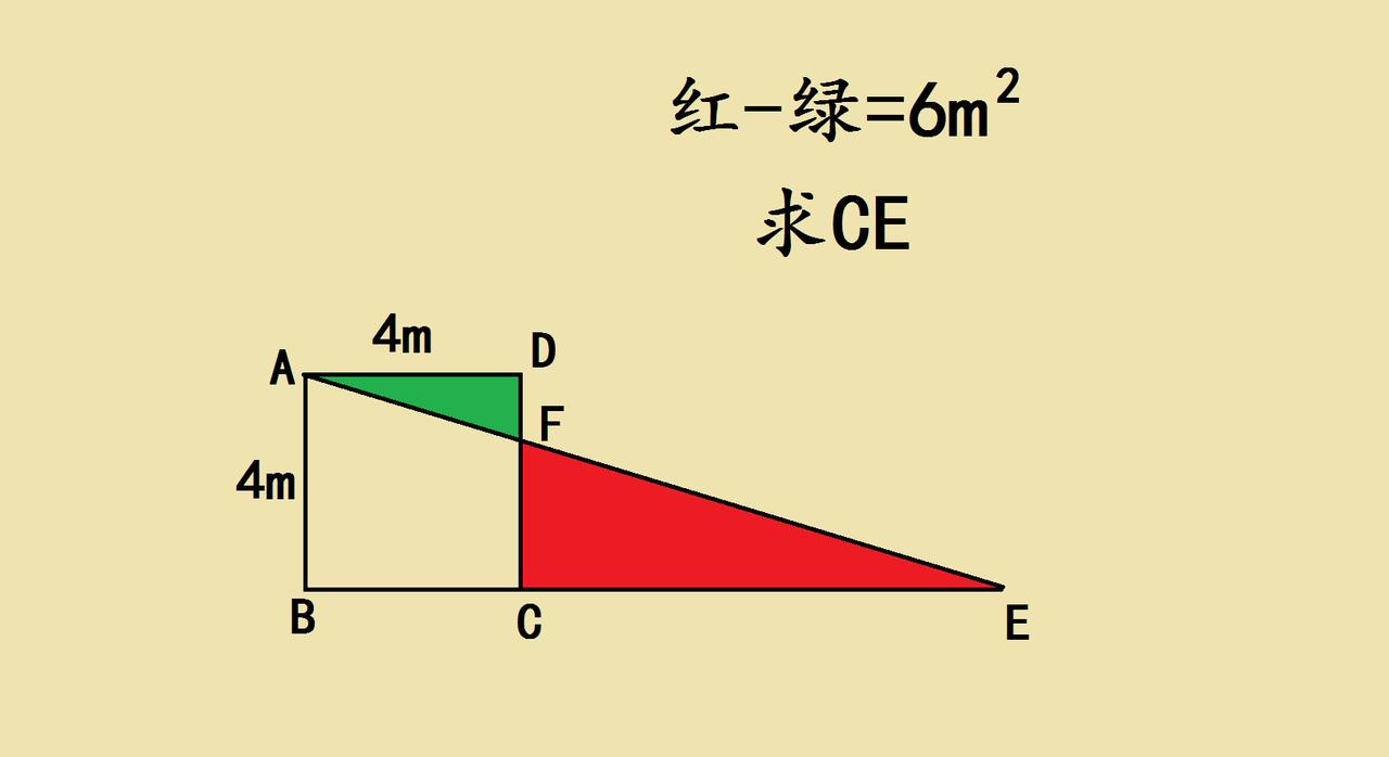 🔥五年级几何难题秒解!正方形边长4米,红减绿等于6㎡,求CE长度 今天分
