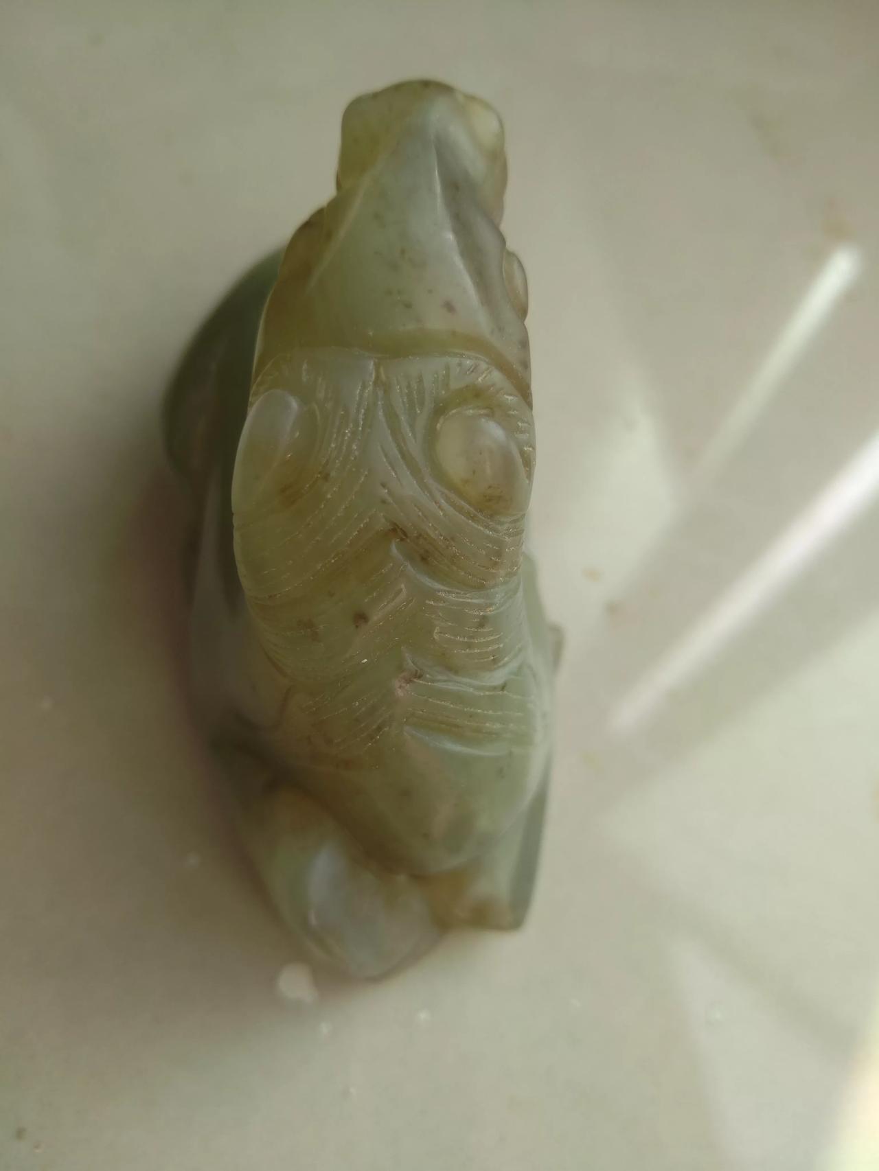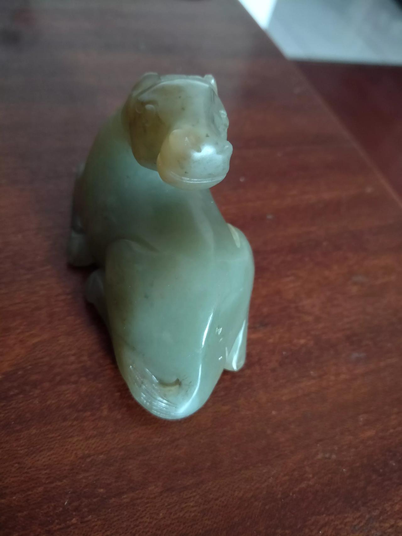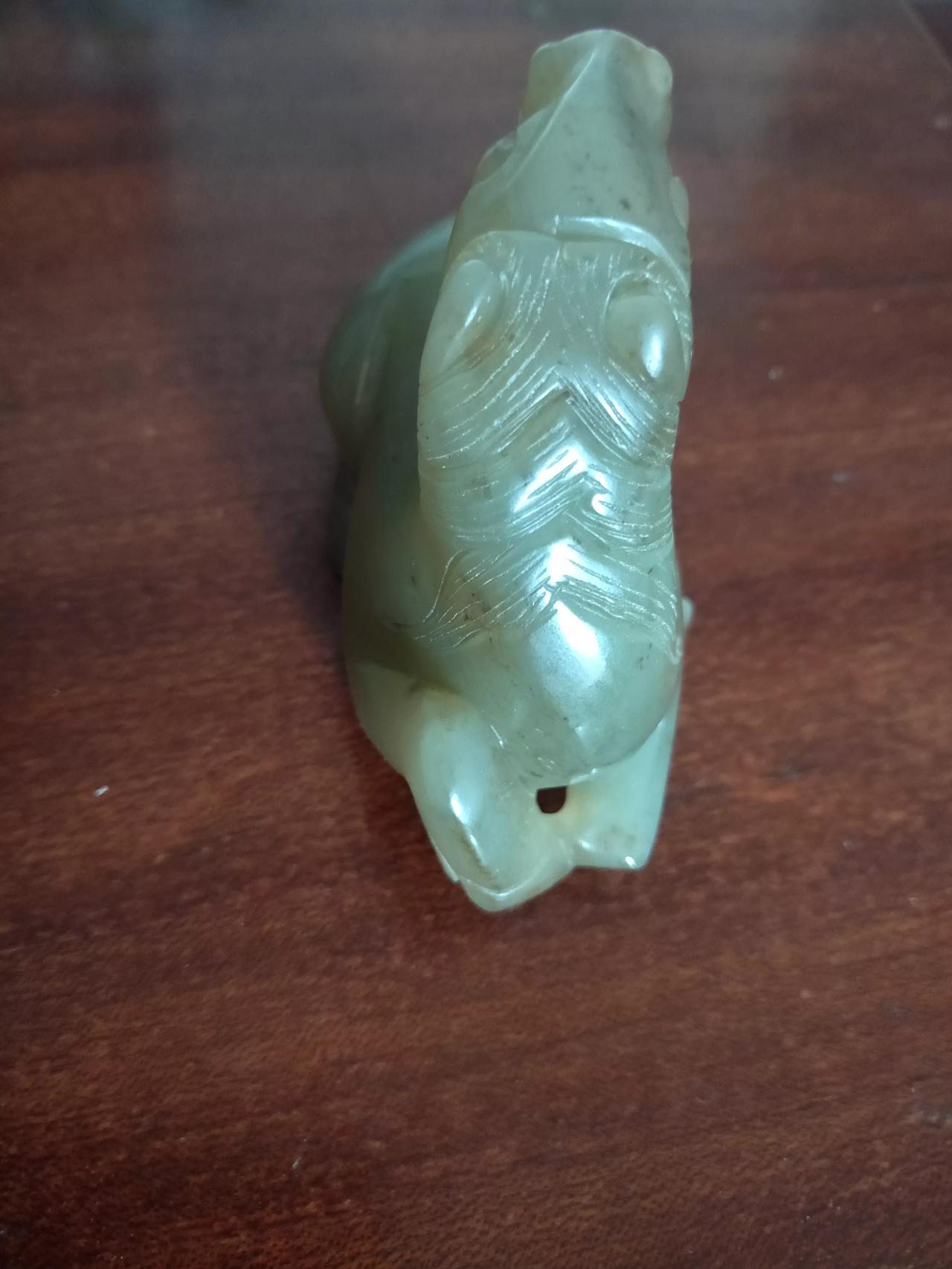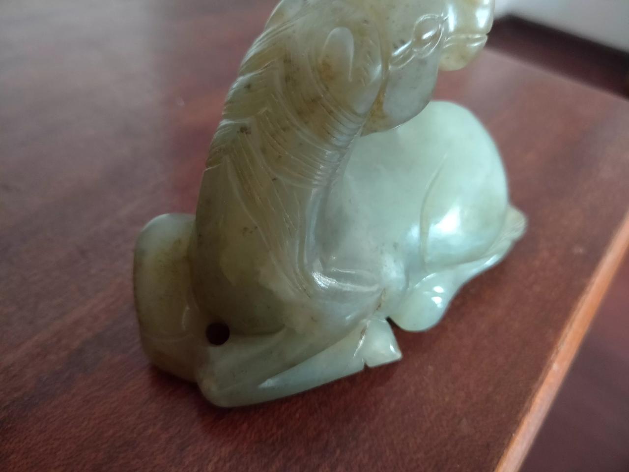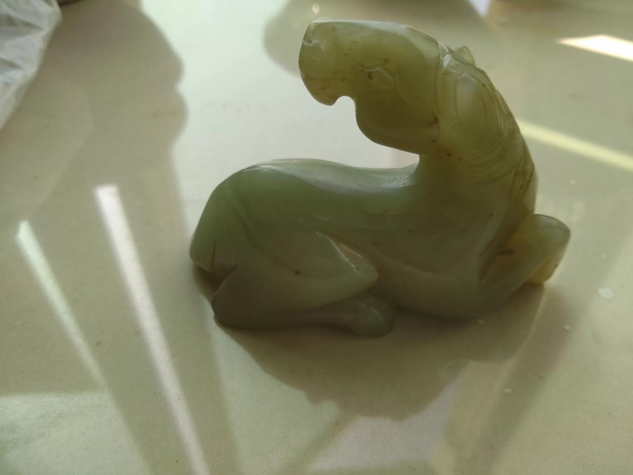 和田青玉卧马,重两百多克,有轻微沁色,有冰裂纹。雕刻生动形象,尤其是头部雕刻写实