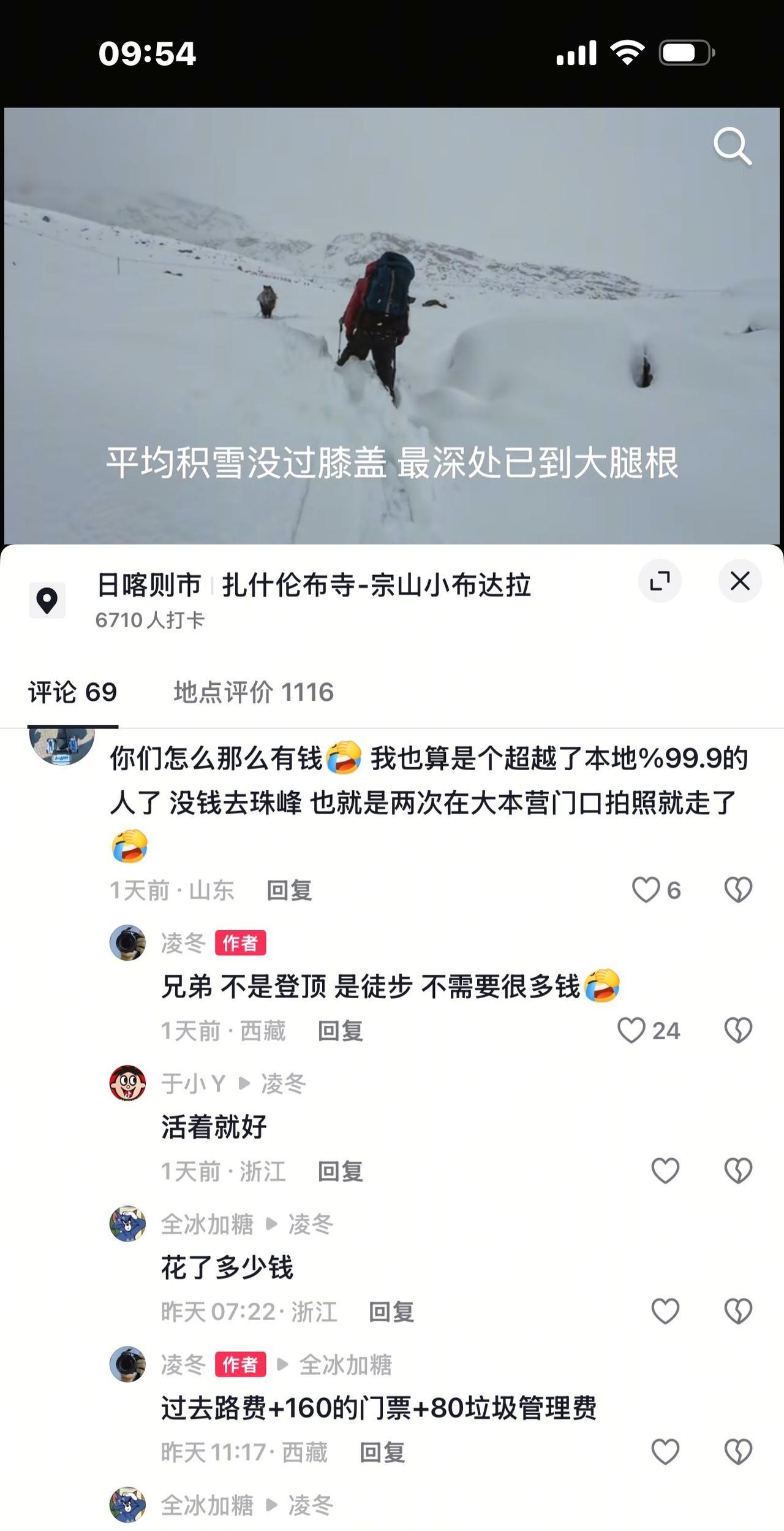 原来徒步珠峰东坡是穷游,只要一万块! 具体费用是: 过去的路费+160的门票+80垃圾管理费 比起动辄几十万的攀登珠峰项目,徒步珠峰真是穷游,小巫见大巫了。 而且,9、10月份徒步珠峰东坡是最适合的,难怪人们趋之若鹜,这次突降暴雪,有1000多游客被阻滞在那里。 徒步珠峰东坡,如果遇上好的天气,一路景色美不胜收,沿途你可以欣赏到壮丽的雪山、深邃的湖泊、原始的森林和灿烂花海等多种绝美景色。 在珠峰东坡上,你还可以从东侧观赏到世界第一高峰,海拔8848米的珠穆朗玛峰,它秀美的身姿在蓝天映衬下,壮观无比。 在珠峰东坡上,你不仅可以看到珠峰,还可以观赏到另外的三座高峰,它们是: 海拔8516米的洛子峰(它是世界第四高峰),海拔8463米马卡鲁峰(它是世界第五高峰),主峰海拔7804米的珠穆朗卓峰。 在珠峰东坡,你不仅可以欣赏到壮丽的山峰,还可以看到两个绝美的高山湖泊:晓乌措、措学仁玛。 两个湖泊都倒映着壮丽的山峰,摄人心魄。 措学仁玛是由6个小湖连成的,相隔很近,是珠峰东坡最著名的观景平台,澄净的湖水映照五峰,如梦似幻。 在嘎玛沟,你还可以欣赏到珠峰地区保存最好、面积最大的原始森林,从谷底上到海拔4000多米,就可见青冈、垂柏、云南铁杉等耐寒树木郁郁葱葱。这片原始森林的植被非常茂密,绿意盎然,潺潺溪流,更添生机。 徒步珠峰东坡,从海拔2100米往上,还可以领略高山花海,这里花卉繁多,特别是五六月份,高山杜鹃红似火,幽蓝的龙胆、高耸的塔黄、淡紫的鸢尾、洁白的雪莲等,构成一片美得令人心醉的花海。 不过,这些美景要在天气好的情况才能尽收眼帘, 由于高山地形复杂,山地气候多变,气象观测资料匮乏,所以天气难以预测。 光说地形,因为有巨大的海拔落差、复杂的山地地形,使得气流运动复杂,容易形成局地性的山谷风、冰川风等特殊风系,且不同海拔、坡向的气温、降水差异很大,所以准确预报天气就难了。 据说这次天气预报就没有太准,迟报了两天的暴风雪,让游客措手不及。 另外,许多人是小白,第一次徒步珠峰东坡,之前徒步经验不多,更是雪上加霜。 所以出门看天气,去珠峰东坡徒步,运气好就是绝世美景,运气差就会像这次1000多人突然遭遇暴风雪,狼狈不堪,被虐惨了,有的人还失温,要派数百人去救援,否则后果不堪设想,真的会丧命的! 如今安全下撤,想必这次的徒步经历让他们终身难忘吧。 [泪奔][泪奔]