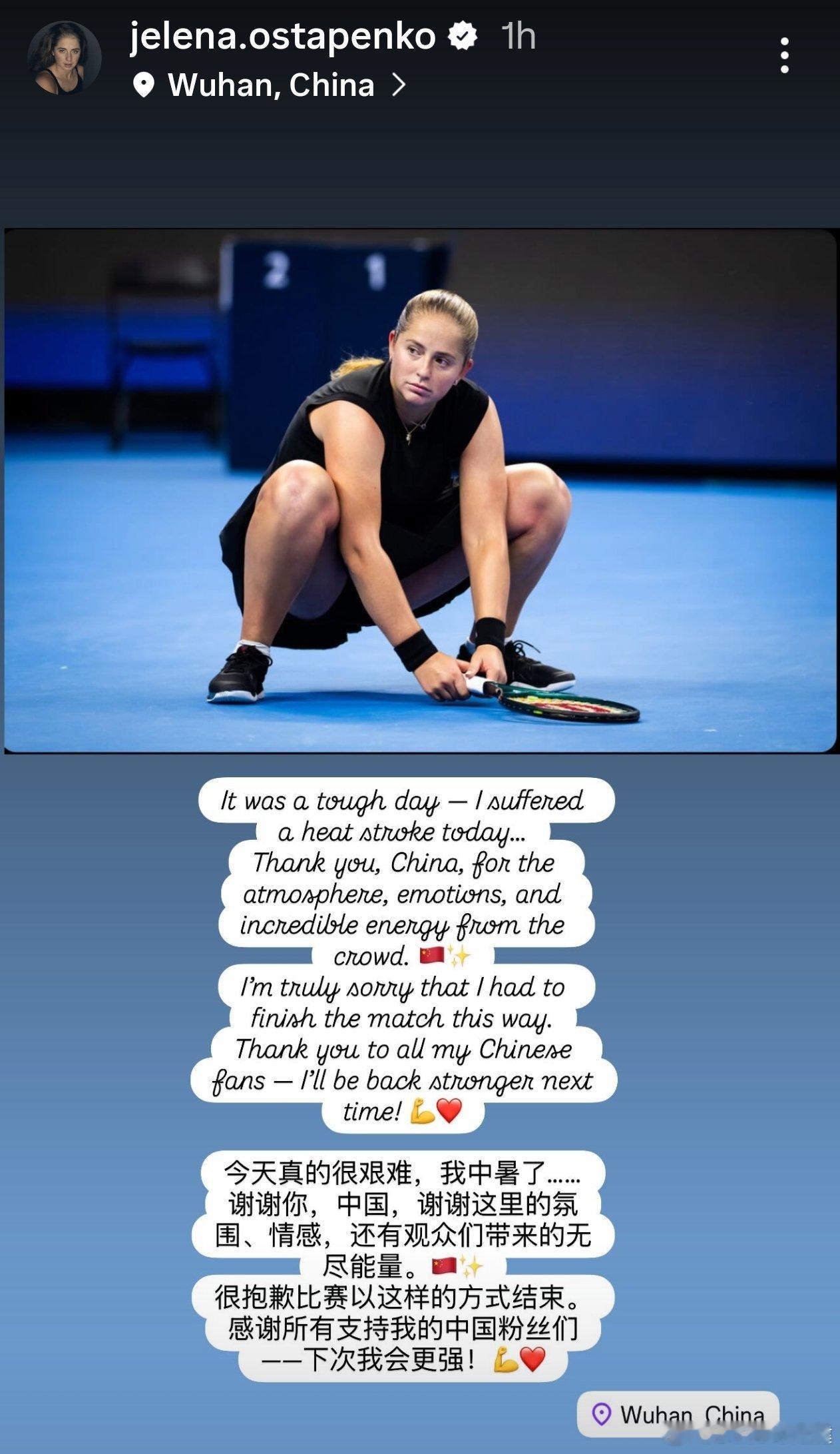 今天真的很艰难,我中暑了……谢谢你,中国,谢谢这里的氛围、情感,还有观众们带来的无尽能量。很抱歉比赛以这样的方式结束。感谢所有支持我的中国粉丝们—-下次我会更强!Wuhan,China