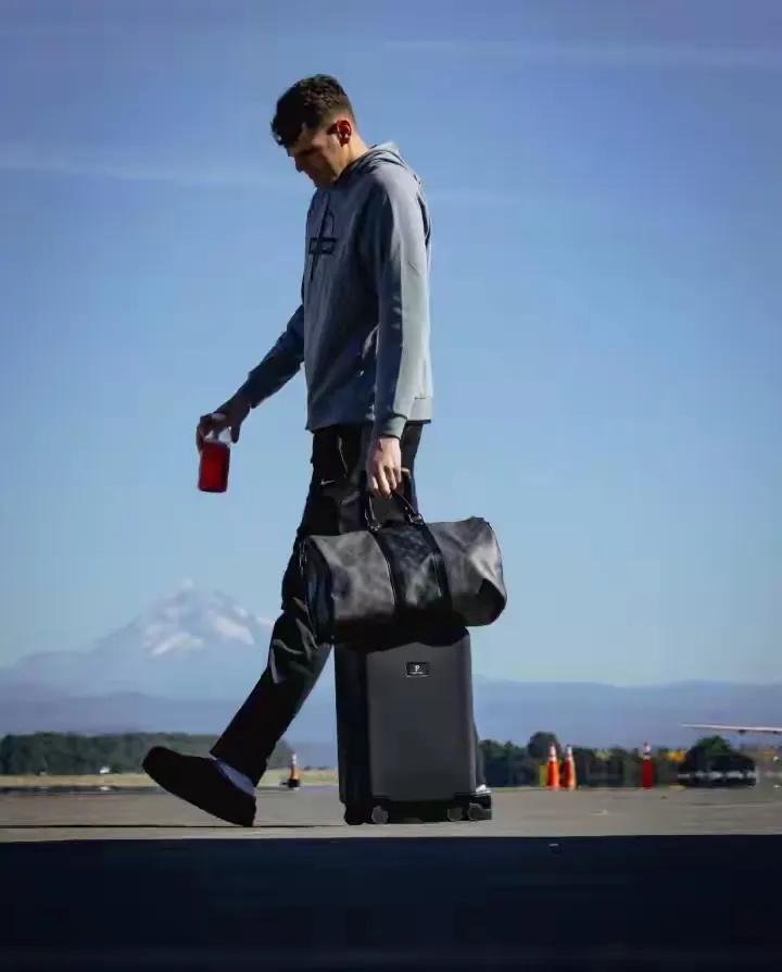 首秀10月9日开启,杨瀚森背上专属粉色小书包登机出发,开拓者官方首页晒杨瀚森照片