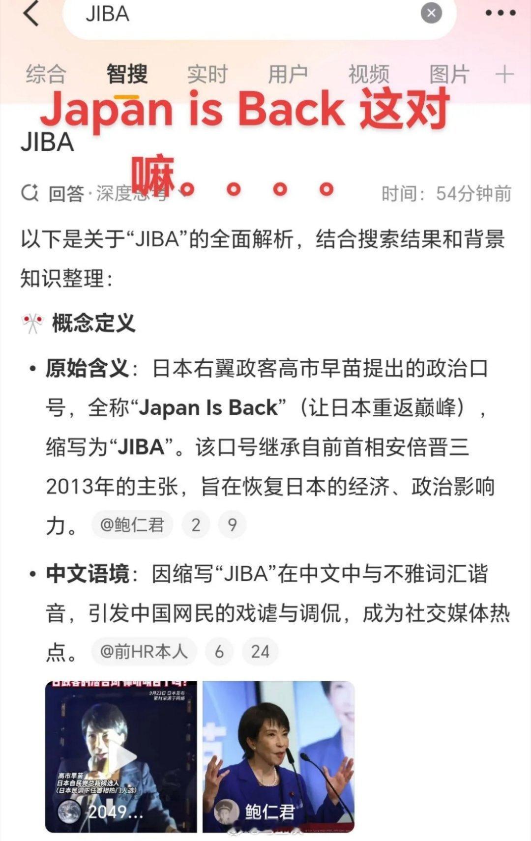 高市早苗早先竞选口号:Japan is back again,缩写“JIBA”在中国被嘲笑后,又传到了日本…虽然…但是…我真的忍不住想笑,我的道德教养都不能阻止了我了:以后中国网友每一次用这个词汇爆粗口,都在暗暗为日本鼓劲~[笑cry]