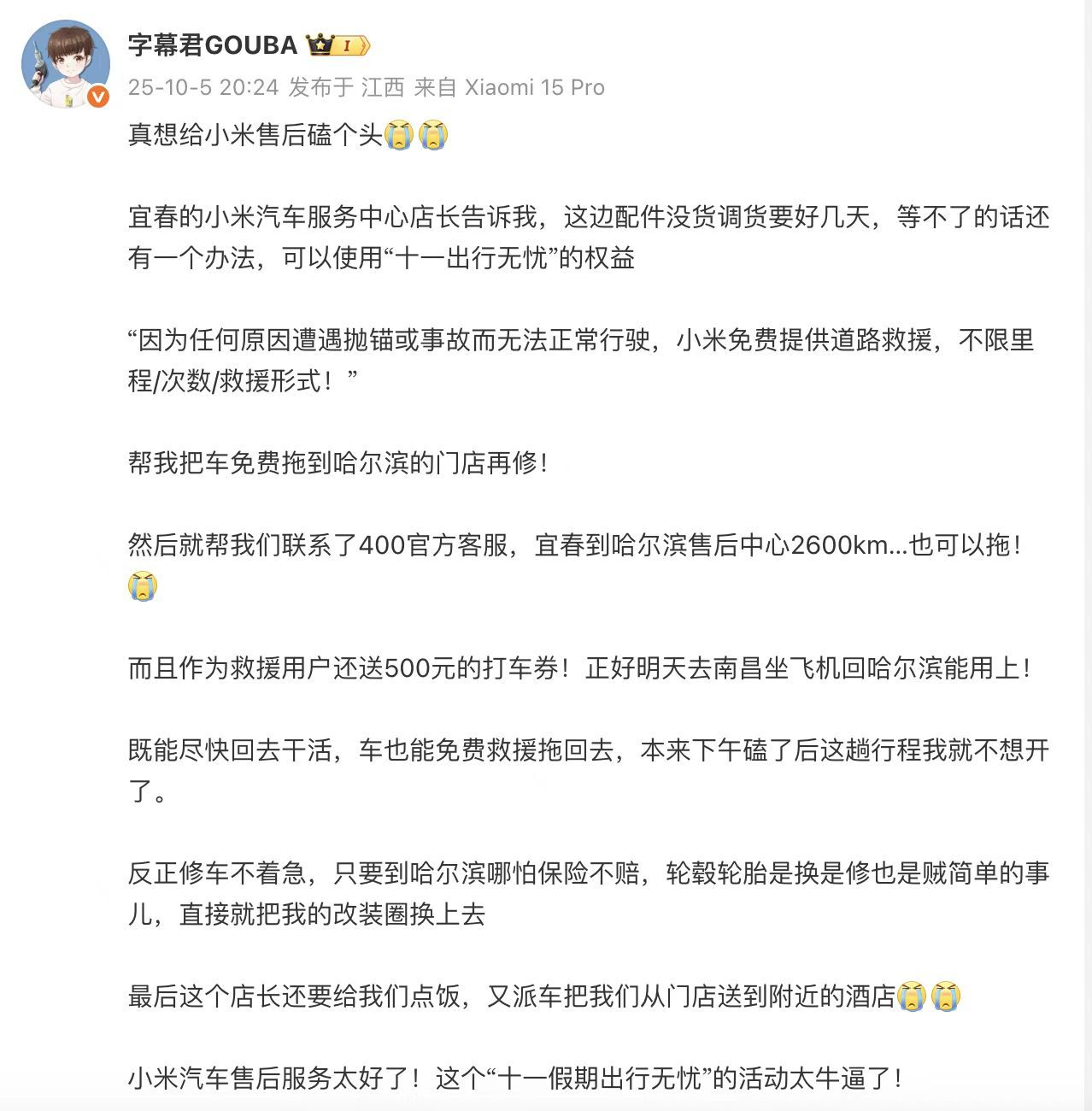 还有24小时救援、机场打车券、返程后的免费秋季检测……这些没有门槛的保障,让人感受到小米满满的诚意。