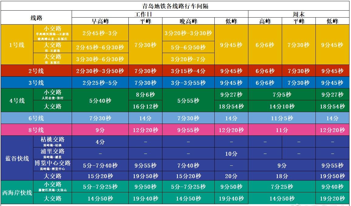 【10月9日起,青岛地铁首末车、行车间隔调整】根据客流变化趋势、旅游旺季延时安排,以及对各线路首末班车乘车人数的数据采集和分析,10月9日起,青岛地铁旅游旺季延时运营结束,线网各车站首末车时间调整。(观海新闻、青岛地铁)