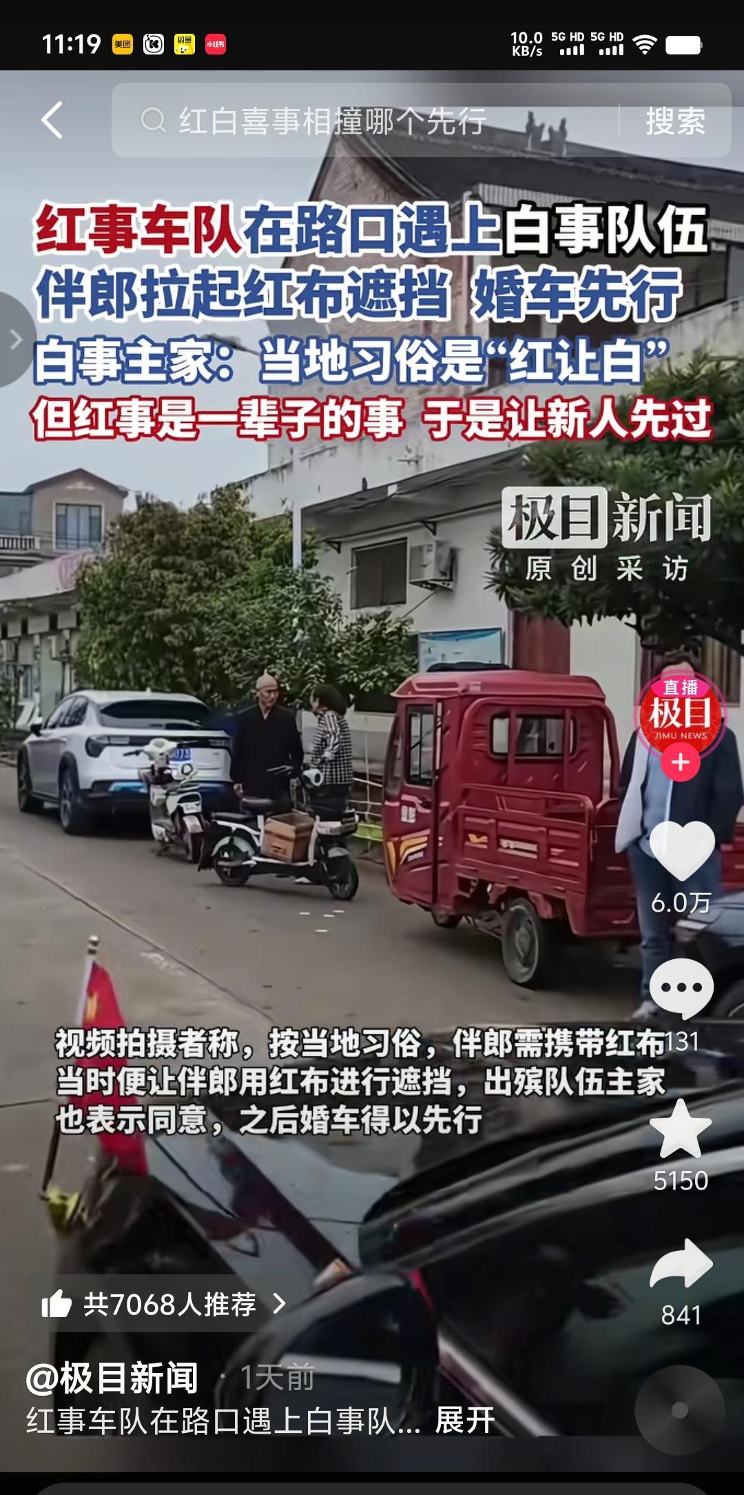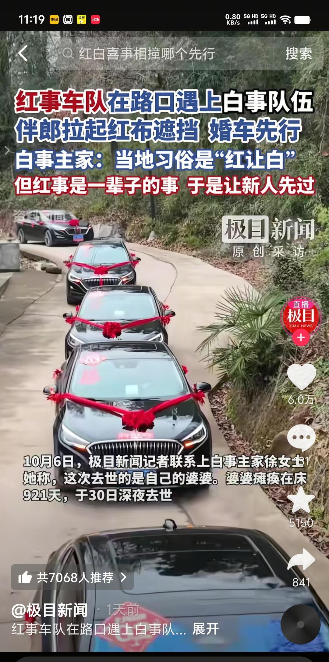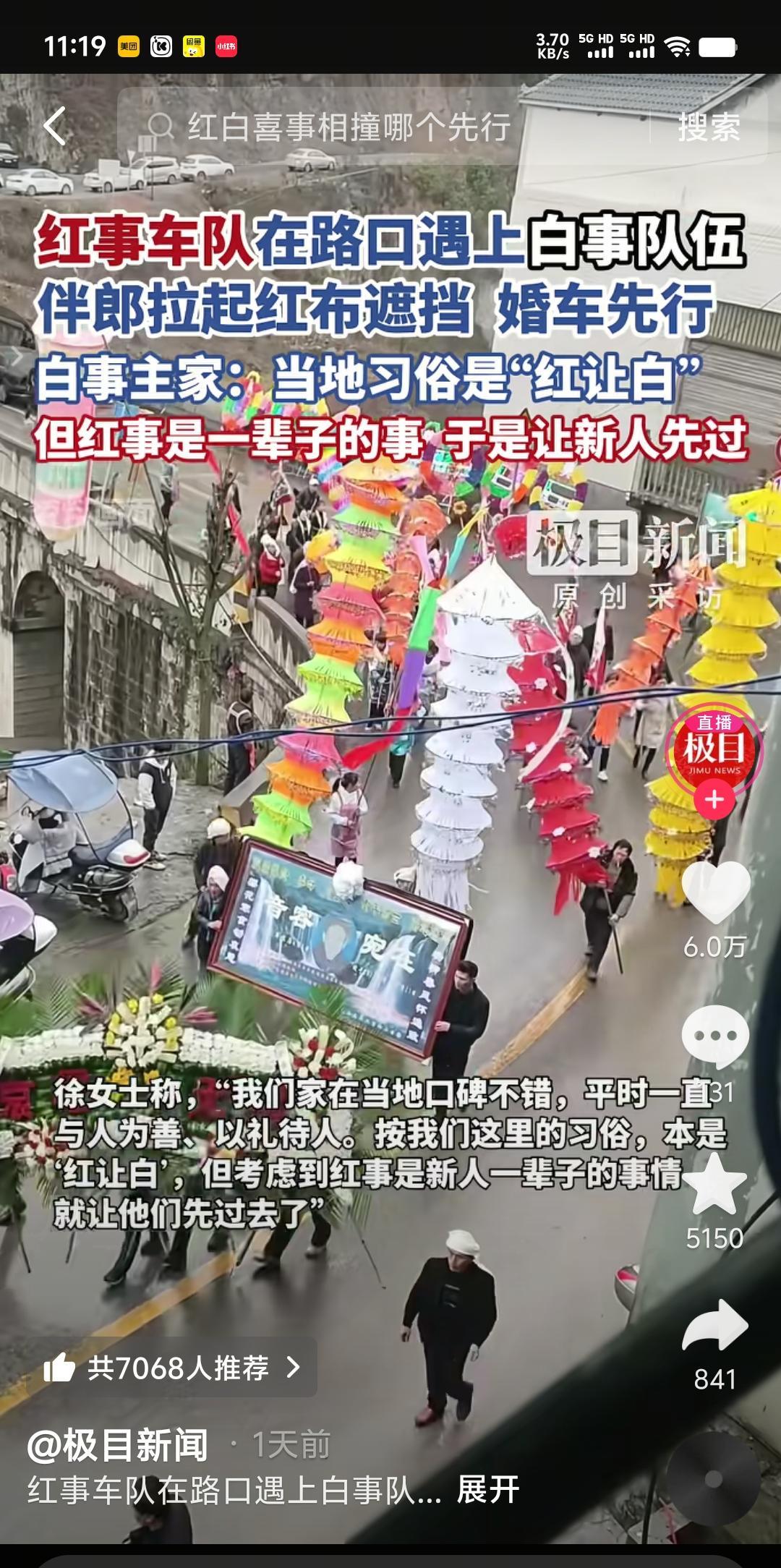 “红白不见面,见面红布挡”。白事遇红事,狭路相逢,不能说是冤家路窄,最起码应该是两家人心里都不是滋味。 10月4日,河南焦作就碰巧发生了一起迎亲队伍与一支出殡队伍相遇事件,可想而知当时场面有多尴尬。更主要的是发生这样百年不遇的红白相撞,出于心理作用,难免对双方都造成一定的阴影。按当地风俗,应该是死者为大,红让白。正当两家都心存顾虑举棋不定的时候,这时白事主家徐女士站出来主动让步,并声称“红事是一辈子的事”,于是伴郎用一块白布挡住殡葬队伍,让婚车先行通过。 据说这次去世的是徐女士婆婆,婆婆瘫痪在床有921天,于30日深夜去世。在当地口碑不错,与人为善,以礼待人。所以说徐女士这次虽然向风俗作出了退步,但却赢的了人品。