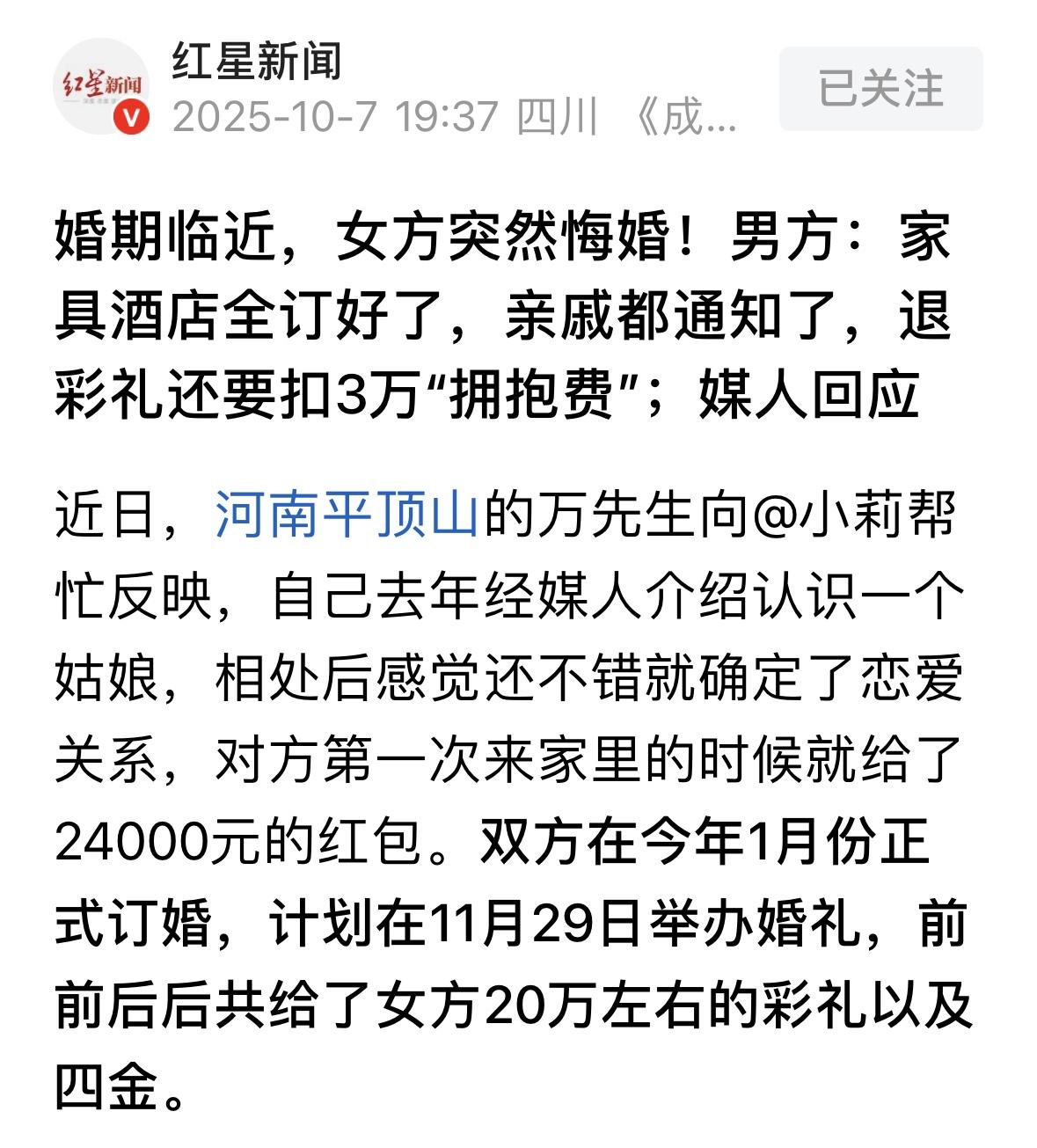 河南平顶山,男子拿出20万彩礼娶女友进门,谁知,俩人婚纱照拍了,婚宴定了,亲戚朋友也都通知了,女方却因为嫌男子工资低、太老实,突然悔婚了,男子让女子退回彩礼钱,女子却说,当时拍婚纱照俩人拥抱了一下,她觉得自己被占了便宜,很吃亏,所以要扣掉3万“拥抱费”,这让男子彻底傻眼…… 万先生去年经媒人牵线,他认识了邻村一个姑娘,两人相处下来觉得挺合得来,就确定了恋爱关系。 姑娘头回来家里时,万先生按照当地习俗给了她24000元的见面红包,这事儿就这么定了下来。 今年一月份,两家人正式订了婚,婚期定在11月29号。 万先生前前后后给了女方将近20万彩礼,外加“四金”,包括金项链、金手镯、金戒指和金耳环。 婚纱照拍了,婚宴酒店也订好了,亲戚朋友都通知了个遍,眼看着就要办喜事了,女方突然说不结了。 这事儿把万先生全家都整懵了。 媒人私下里跟他说,女方可能是嫌他太老实,工资又不高,心里头打起了退堂鼓。更离谱的是,退钱的时候女方居然要扣3万块“拥抱费”。 为啥呢?就因为拍婚纱照时,摄影师抓拍了两人在镜头前拥抱的照片,女方觉得自己被占了便宜,吃亏了,这拥抱得算钱。 媒人也是头一回遇见这种人,说我介绍了上千对,就这一家事儿多!这事儿太不合情理。 万先生也尴尬得不行,他说自己从来没听说过退婚还能收“拥抱费”的。 记者后来联系女方父亲,对方承认确实有扣3万块“拥抱费”这回事,但他说这是孩子自己提的要求。 至于为啥突然不结婚了,女方那边只是轻描淡写地说“不想和他结婚”,没提别的矛盾。 有人说,虽然我是女的,但我站男方这边,怎么会有这样的人,这种钱都赚,不怕遭报应吗? 应该违约一方负全部责任。包括酒店订金,婚纱等所有开支都应由违约方负责。 我们这边要是女方提出退婚的,男方家给女方家所有东西全部都要退还的。 结婚是一辈子的大事,尤其是对农村人人来讲亲戚朋友都通知了,十里八乡都知道你要结婚了,结果你来这一出,还有脸要拥抱费? 必须退所有彩礼费,另外补偿婚纱照损失,日常消费损失,酒店订金,通知亲朋好友的礼品损失。此外,还要精神赔偿及名誉损失。退婚可以,人生可以后悔,有选择权,但是,请把人家损失补上! 那么,从法律角度,怎么看待这件事? 《最高人民法院关于适用〈中华人民共和国民法典〉婚姻家庭编的解释(一)》第5条规定:当事人请求返还按照习俗给付的彩礼,若查明属于以下情形,人民法院应支持双方未办理结婚登记手续;双方办理结婚登记但确未共同生活;婚前给付导致给付人生活困难。 万先生与女方虽然已经订婚并计划结婚,但没有办理结婚登记手续,属于法条第一项情形。 万先生前后支付20万彩礼及四金,符合“按习俗给付彩礼”的认定标准。女方突然退婚导致婚姻未成立,根据该司法解释,万先生有权要求全额返还彩礼及四金。 而女方主张扣除“3万元拥抱费”缺乏法律依据,彩礼返还范围应以实际给付的财物为准,非基于婚姻关系的情感补偿,如拥抱,不属于法定返还范围。 法院如果介入了,会重点审查彩礼金额、给付时间及婚姻未成立的因果关系,而非支持附加不合理条件。 《民法典》第1046条规定:结婚应当男女双方完全自愿,禁止任何一方对另一方加以强迫,禁止任何组织或者个人加以干涉。 女方以“不想结婚”为由单方面解除婚约,虽未明确说明具体矛盾,但符合婚姻自由原则的核心要求,就是公民有权自主决定婚姻关系是否成立。 然而,婚姻自由不等于免除民事责任。 女方在行使退婚权利时,需要配合处理因婚约产生的财产关系,比如彩礼返还,不能以“婚姻自由”为由拒绝返还合理财物。 女方父亲承认“拥抱费”系孩子提出,但该要求既无法律依据,也违背公序良俗。 法院会区分“婚姻自由”与“财产纠纷”,在保障女方退婚权利的同时,严格审查彩礼返还的合法性,防止以自由之名损害对方财产权益。 这事儿闹得两家都不痛快,好在最后还是双方坐下来好好商量,女方当场退还了170500元现金,剩下的钱算是给万先生的补偿。 有人算了一笔账,说前前后后一共拿了20万加四金,就抱了一下,最后拿回170500,抱了一下挣3万块加4金,世上怕是没有比这更好挣的钱了! 如今,婚宴酒店退了,婚纱照也收起来了,万先生又回到了一个人的生活,希望他以后能遇见一个真心实意想跟他过日子的人! 对此,你怎么看? 关注@运良说法 学法律知识不迷路