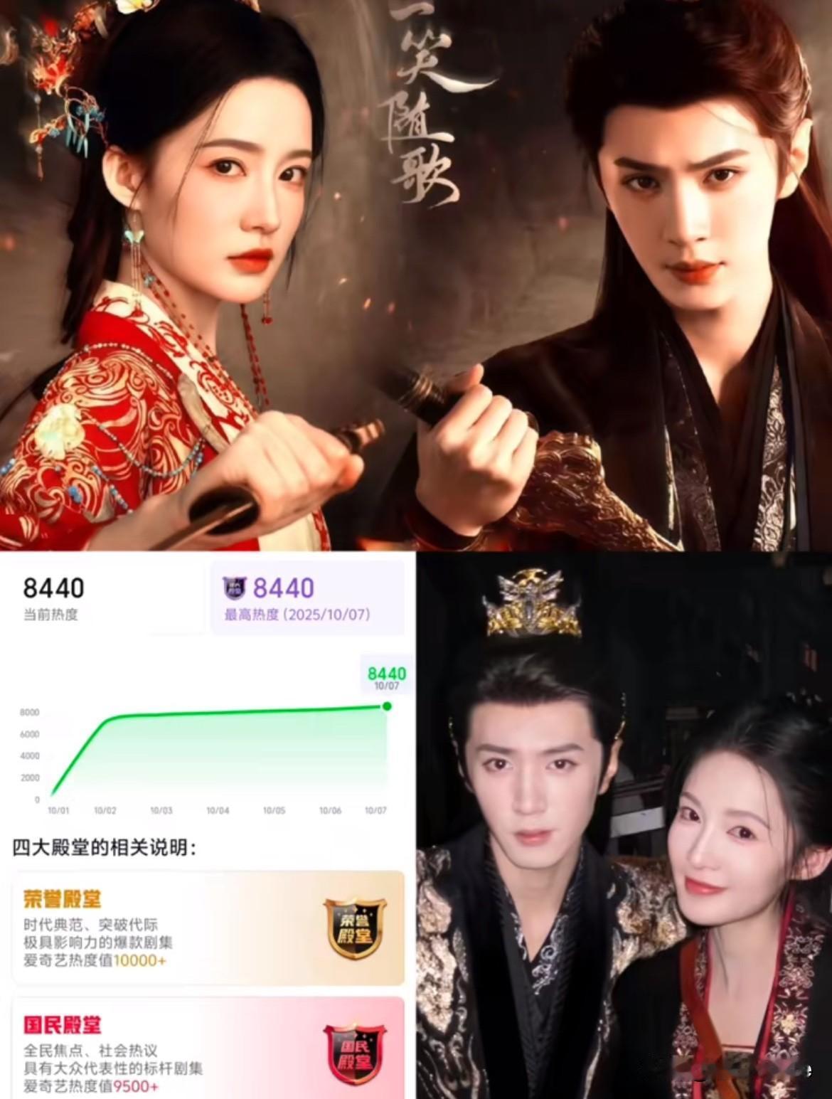 10月8日,李沁陈哲远《一笑随歌》热度破8400,剧集🥝的国民殿堂只差100热