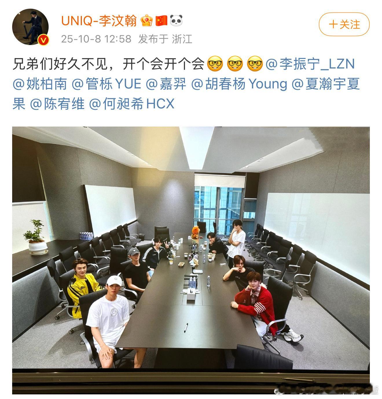 UNINE要重组了吗??李汶翰、李振宁、姚柏南、管栎、嘉羿、胡春杨、夏瀚宇、何昶希合体线下开会,李汶翰发博还艾特了陈宥维!
