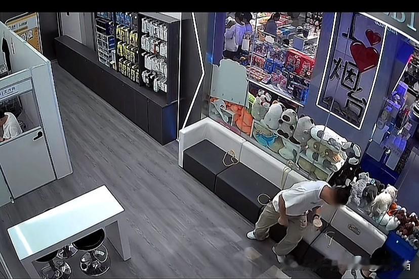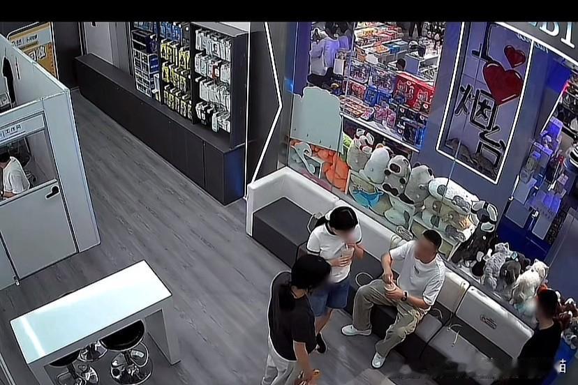山东烟台,四人结伴到店里坐着免费充电,临走的时候黑衣男子故意把数据线扯断。店主报