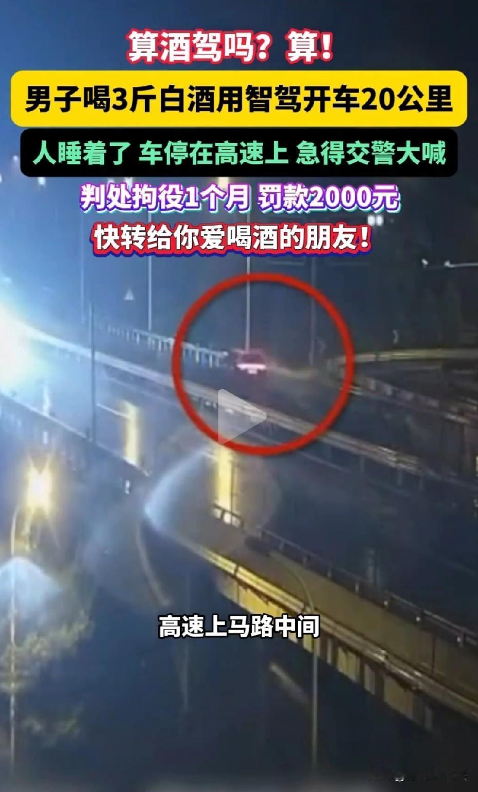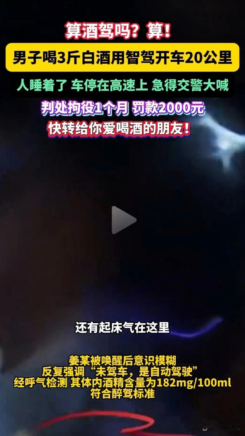 异想天开!胆大妄为! 近日,浙江杭州,一名男子购置了一辆具备智驾功能的新能源轿车。为测试该车的智驾水平,他竟豪饮3斤白酒,随后开启车辆的智驾功能。车辆行驶20公里后,停在了高速公路中央。 高速交警发现后,敲窗却无回应,误以为男子突发疾病,便破窗而入。打开车门,一股浓烈的酒精味扑面而来,男子正坐在驾驶位上酣睡。交警费了一番功夫才将他叫醒,他竟称:“我没开车,是自动驾驶。”经酒精测试,男子体内酒精含量达182mg/100mL,属于醉酒驾驶。最终,法院判处其拘役1个月,罚款2000元。 据交管部门权威人士透露,目前我国市场上汽车搭载的“智驾”系统均处于辅助驾驶阶段,尚不具备“自动驾驶”功能,车辆仍需人工操控,驾驶人是最终责任主体。“脱手脱眼”驾驶不仅存在严重的交通安全风险,一旦出事,还可能面临民事赔偿、行政处罚和刑事追责。 高速交警强调,“智能驾驶”只是辅助功能,不能取代人成为驾驶主体,酒后使用“智能驾驶”仍会被认定为酒驾、醉驾。 该男子真是异想天开、胆大妄为。所幸车辆停在高速公路中间后,及时被巡逻交警发现,否则后果将不堪设想。他的行为最终也受到了法律的惩处。