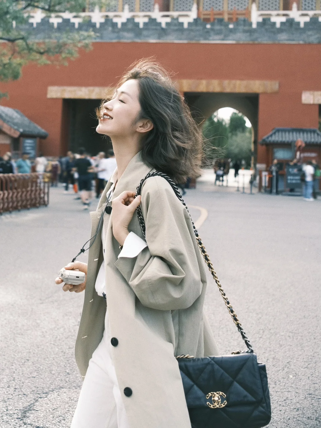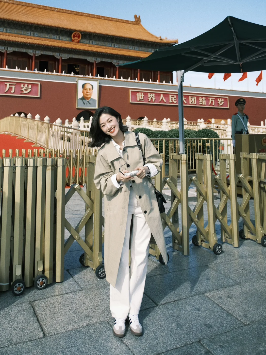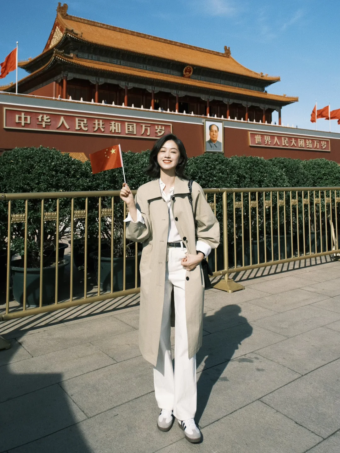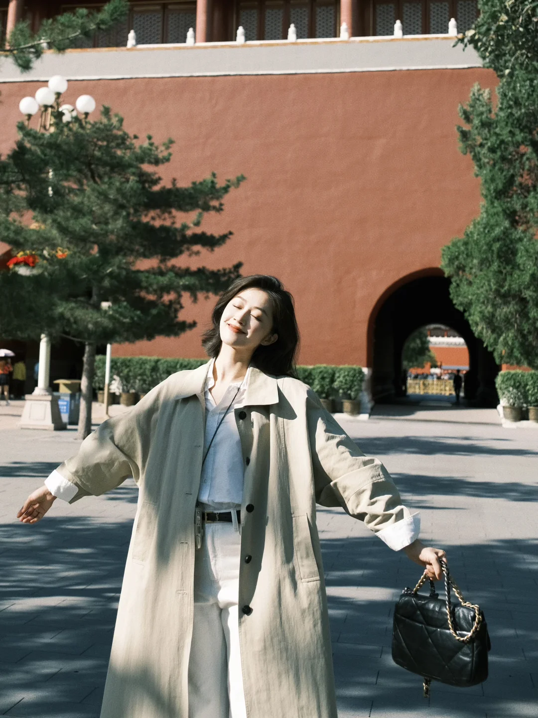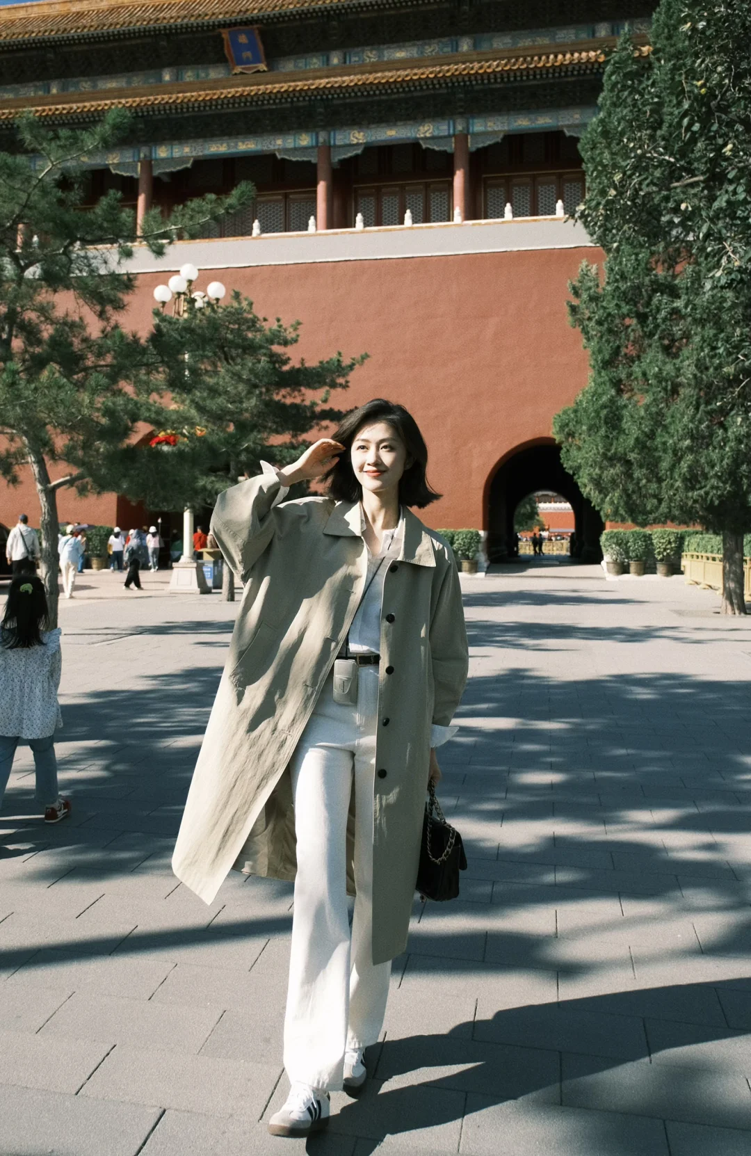 白衬衫+白色裤子+风衣,是好看出片又温度适宜的选择