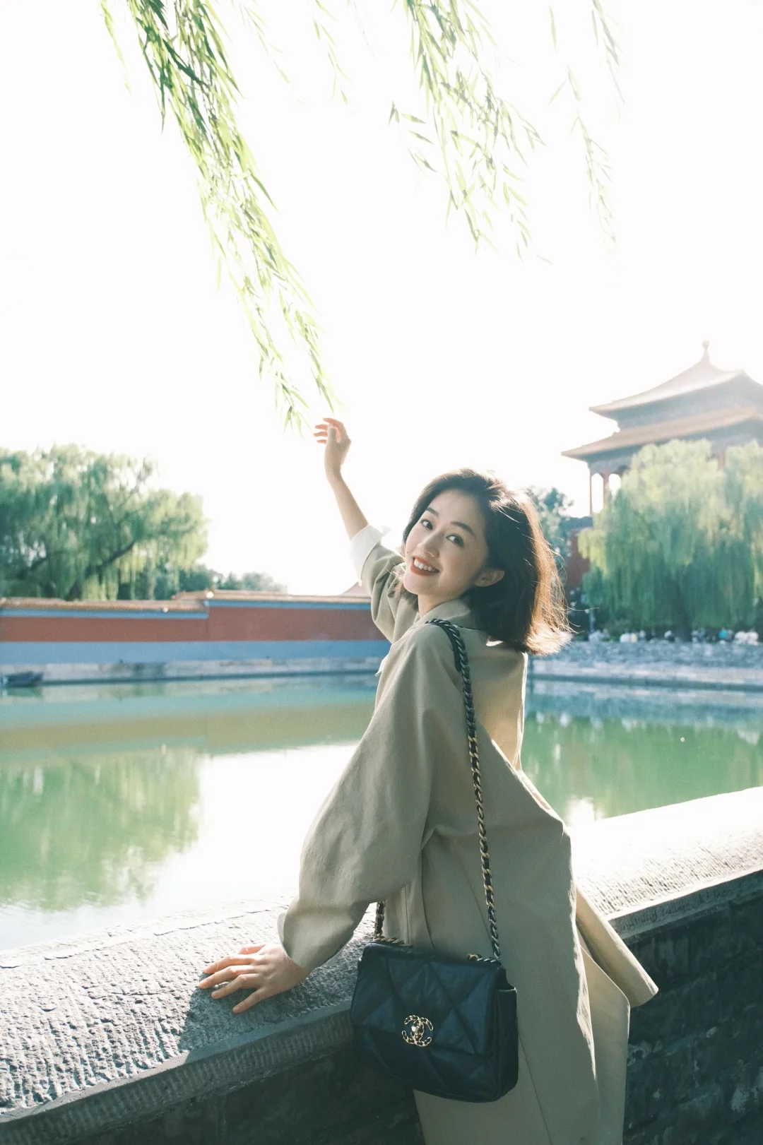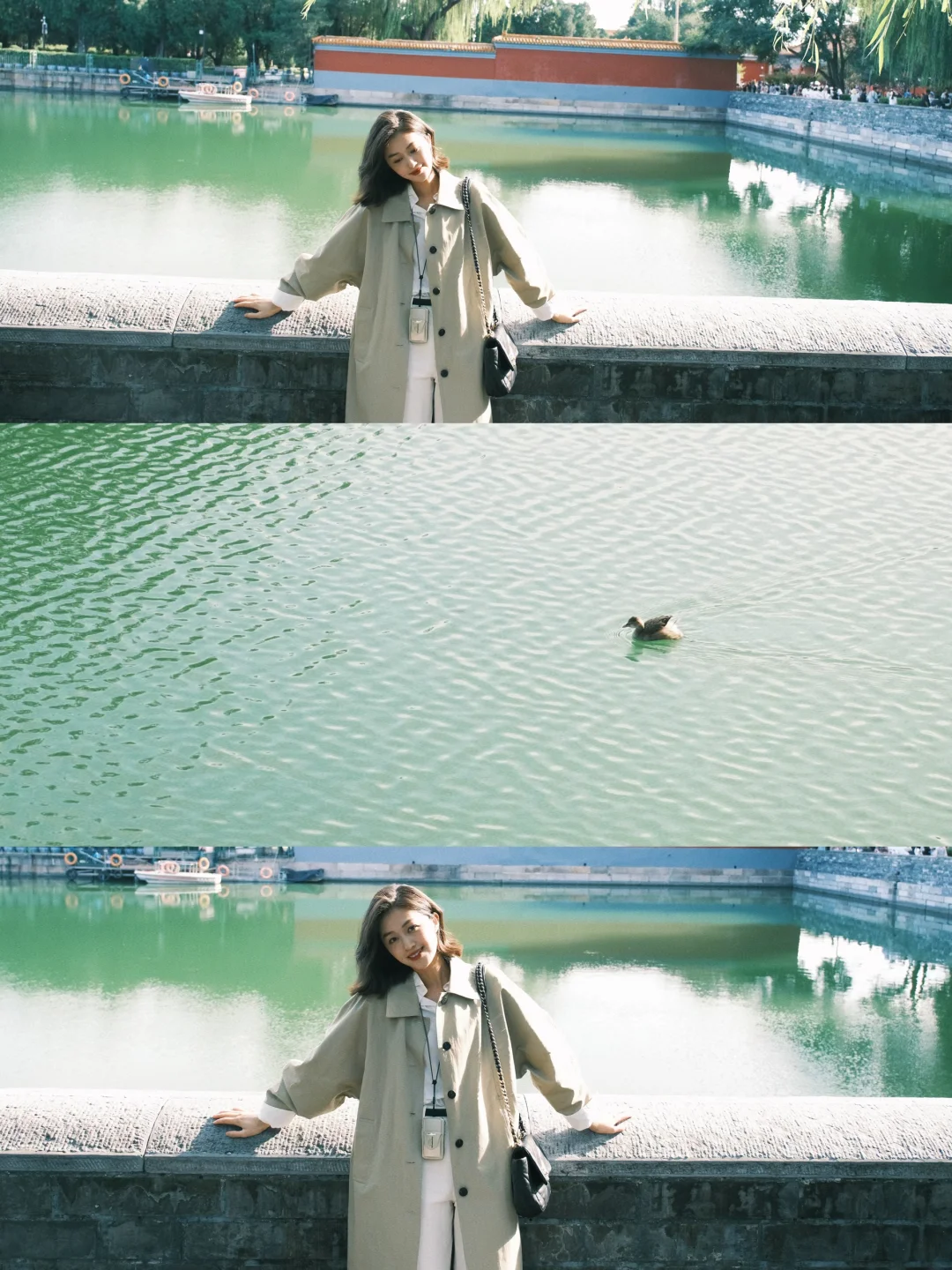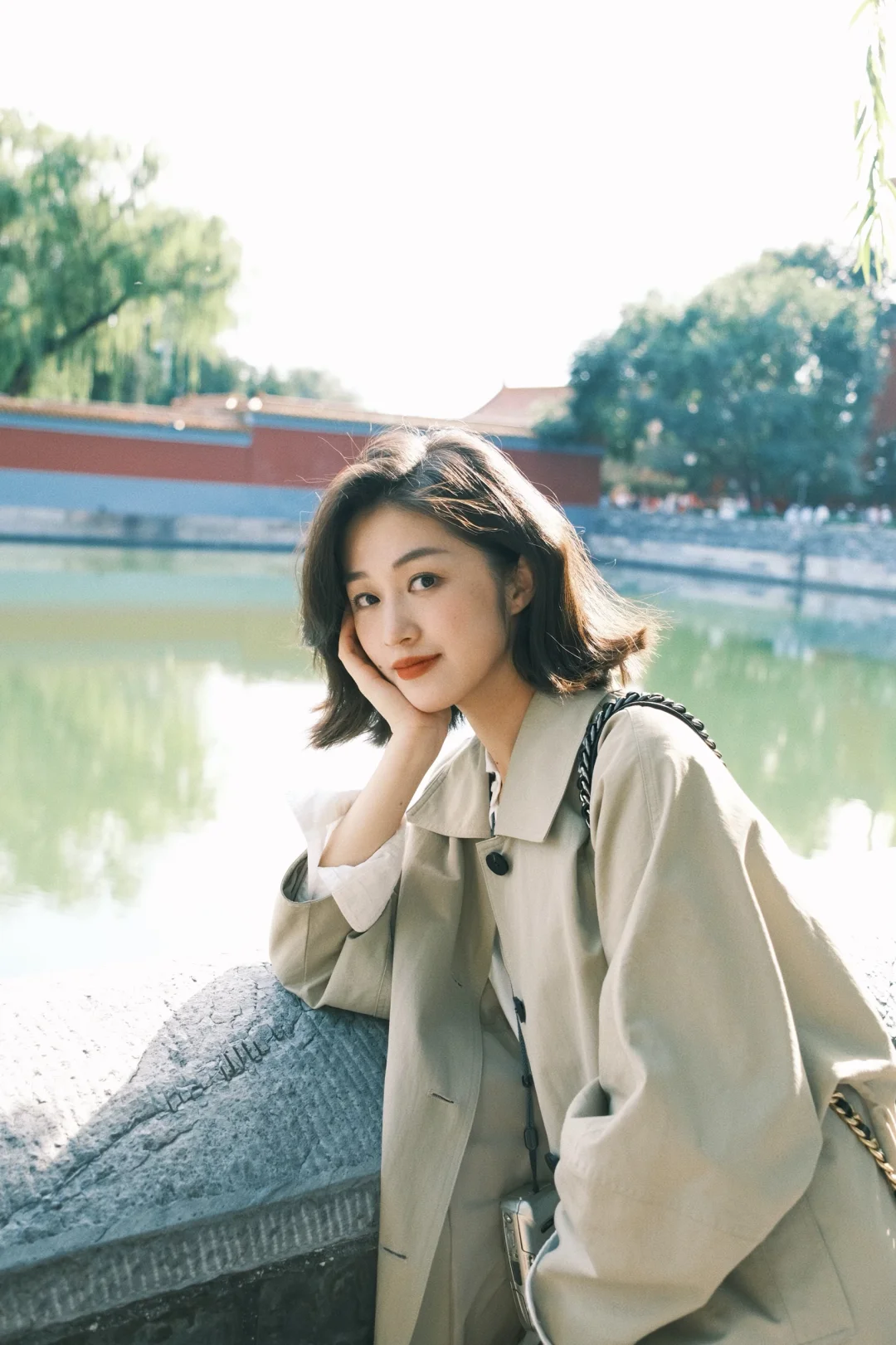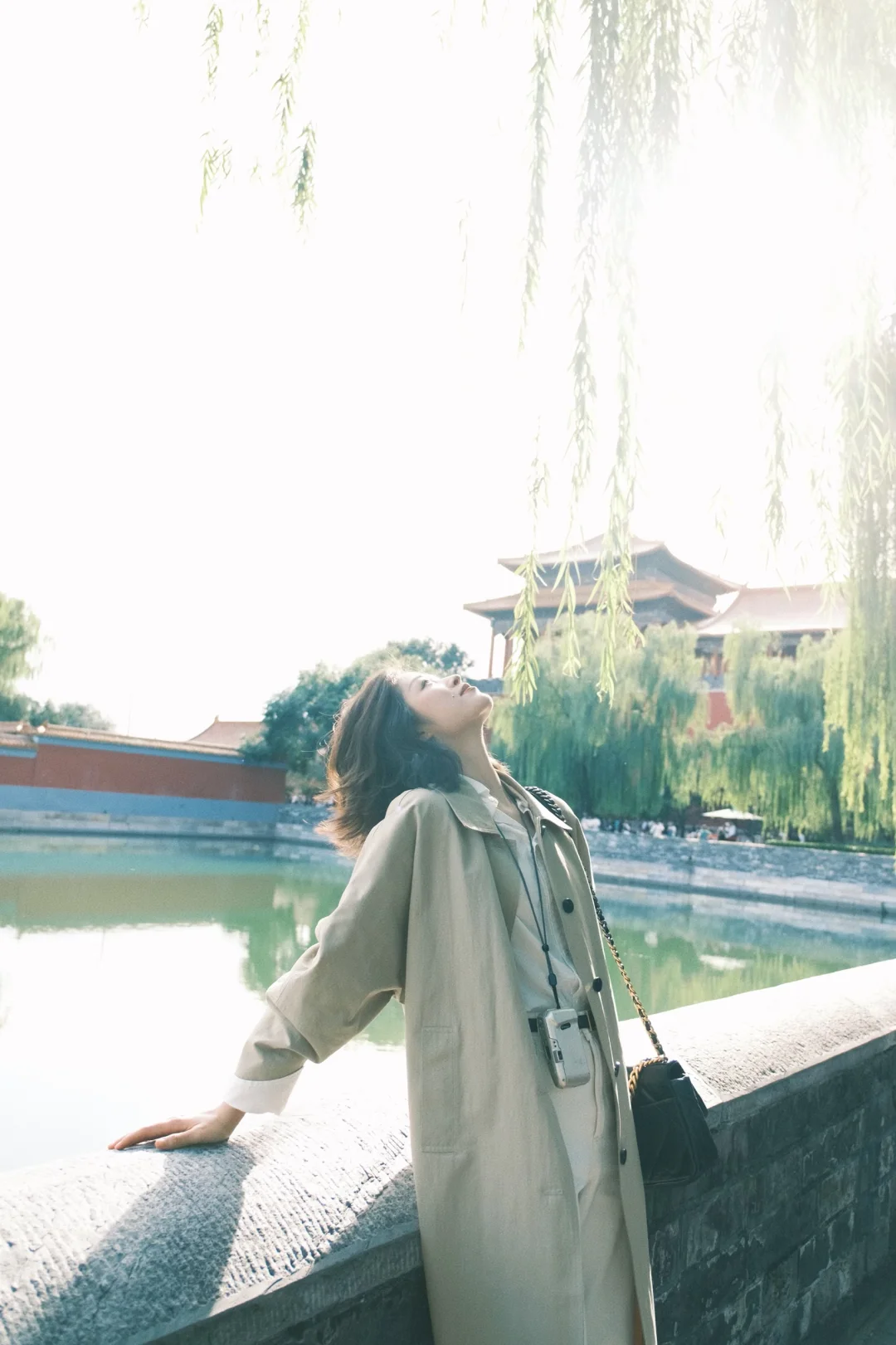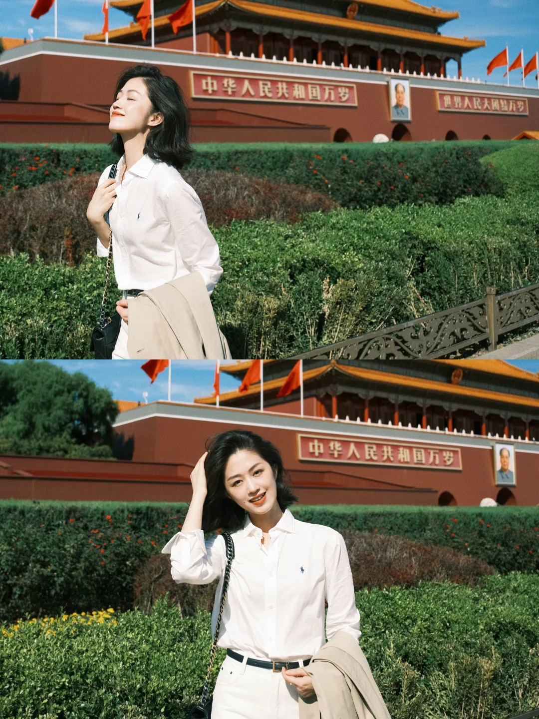 白衬衫+白色裤子+风衣,是好看出片又温度适宜的选择