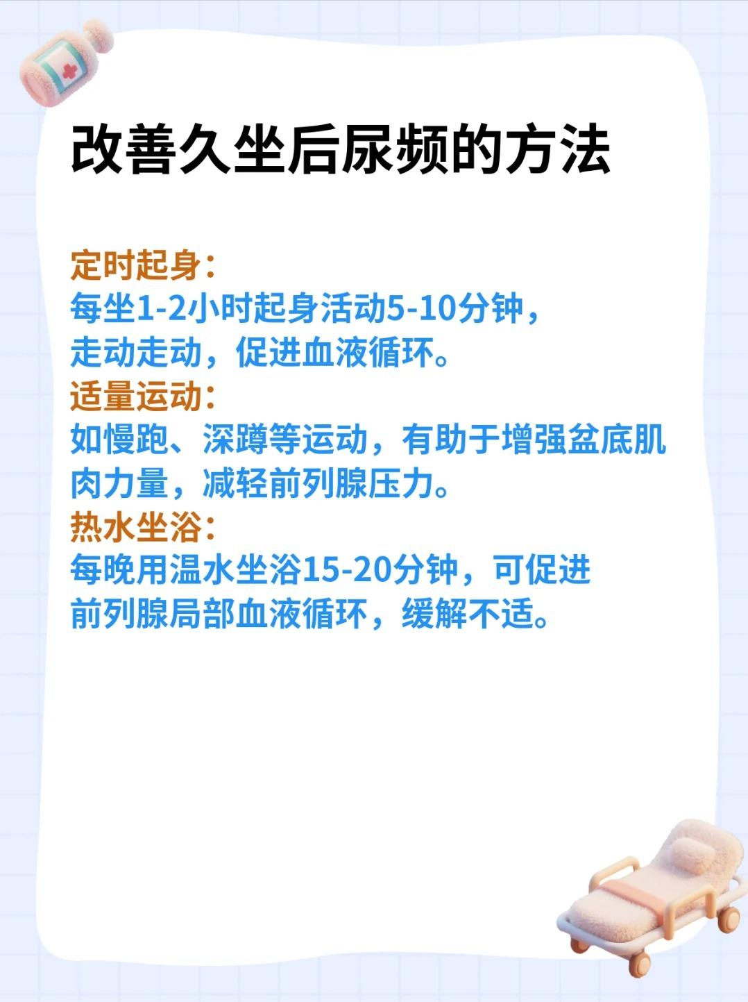 久坐后尿频?可能和前列腺受压有关! 久坐后出现尿频现象,很可能与前列腺受压相关。日常生活中,要尽量避免长时间久坐,定时起身活动,促进身体血液循环,减轻前列腺所受压力。平时要注意个人卫生,保持私密部位清洁。养成良好的饮水习惯,适量饮水,不要憋尿。如果尿频症状持续不缓解或者伴有其他不适,如尿痛、尿急等,一定要及时就医!