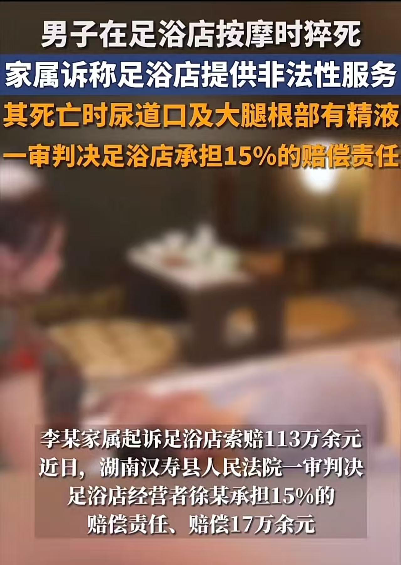 男子在足浴店按摩时猝死,司法鉴定其死亡时尿道口及大腿根部有精液。男子家属认为,足浴店违规向男子提供非法性服务,导致男子过度刺激猝死,向足浴店索赔113万余元,但足浴店对此予以否认,而法院的判决亮了! (来源:红星新闻) 李鑫年纪轻轻,却在足浴店突然死亡,家人认为此事必有蹊跷。而司法鉴定显示,李鑫时尿道口及大腿根部有精液! 这一发现,瞬间让李鑫家属的情绪激动起来。在他们看来,正常死亡的情况下,尿道口根本不可能出现精液。 于是,他们坚定地认为,肯定是足浴店违规向李鑫提供了非法性服务,这才导致李鑫受到过度刺激,最终猝死。 基于这样的推断,家属一纸诉状将足浴店告上法庭,索赔高达113万余元。 然而,足浴店对此却坚决予以否认。他们坚称李鑫的死亡完全是因为自身身体存在问题。 至于尿道口出现精液的原因,他们也是一头雾水,还煞有其事地猜测,可能是李鑫偷偷自己弄的,又或者是他自身身体过于敏感导致的。 而事情要从2025年3月19日凌晨0点左右开始说起,李鑫来到足浴店后,在几个技师当中,挑选了身材最好的68号技师杨某。 随后,李鑫进入房间舒舒服服地洗了个澡,接着便躺在床上,享受杨某为他提供的按摩服务。 时间一分一秒地过去,凌晨1点20分左右,按摩服务即将结束,可李鑫却还在睡梦中。足浴店老板见状,便让前台邓某去查看一下情况。 邓某走进房间,一眼就发现李鑫的身体状况有些异样,她不敢耽搁,立刻通知了店长刘某,刘某迅速拨打了120急救电话。 大约在凌晨1点35分,救护车风驰电掣般赶到。医护人员争分夺秒,在现场对李鑫进行了约十分钟的紧急急救,然而,李鑫却没有任何反应。无奈之下,医护人员只能将李鑫接往医院继续抢救,但最终还是没能挽回他的生命。 在法庭上,法院经过严谨的审理认为,李鑫生前本身就存在心脏病变,法医鉴定其死亡原因系主动脉夹层破裂出血,进而引起心脏压塞,最终导致急性心功能障碍死亡。 而对于家属所称的足浴店违规提供非法性服务,导致李鑫刺激猝死的说法,由于家属无法提供确凿的证据,所以家属必须承担举证不能的不利后果,法院对这一说法不予采信。 从李鑫自身的情况来看,他在凌晨12点前往足浴店按摩,作为一个完全民事行为能力人,他理应对自己的身体状况有足够的认识,对自己的安全问题也应尽到完全的注意义务。很明显,他在这方面存在重大过错,所以应当承担主要责任。 而足浴店这边,工作人员未能及时发现李鑫的异常情况,这显然违反了安全保障义务,理应对李鑫的死亡承担一定的侵权责任。 综合各方面因素考虑,法院最终酌定由足浴店老板徐某承担15%的赔偿责任,赔偿金额为17万余元。 此事引发了热议,有网友说,都说家丑不可外扬,如果是我肯定不好意思去告,给死者留点尊严。如果有一天,我死在那里,我希望我的亲戚不但不要去找人家,并且还要给人家一点赔偿! 也有网友说,足浴店的老板店规要注意啦,看起来有明显三高的,还有老年人恕不接待,不然赚的还不够赔的! 还有网友说,这明显是自身疾病猝死!足浴店除了打120,还要做什么急救措施?难道开个足浴店还得先去读个医学本科? 在这起悲剧中,我们看到了生命的脆弱和责任的界定。 但更值得深思的是,类似这样在娱乐场所发生的意外事件屡见不鲜,背后反映出的是部分人对自身健康的忽视以及一些场所安全保障意识的淡薄。 我们不能总是等到悲剧发生后才来划分责任,而应该从源头上加强健康教育和安全监管!