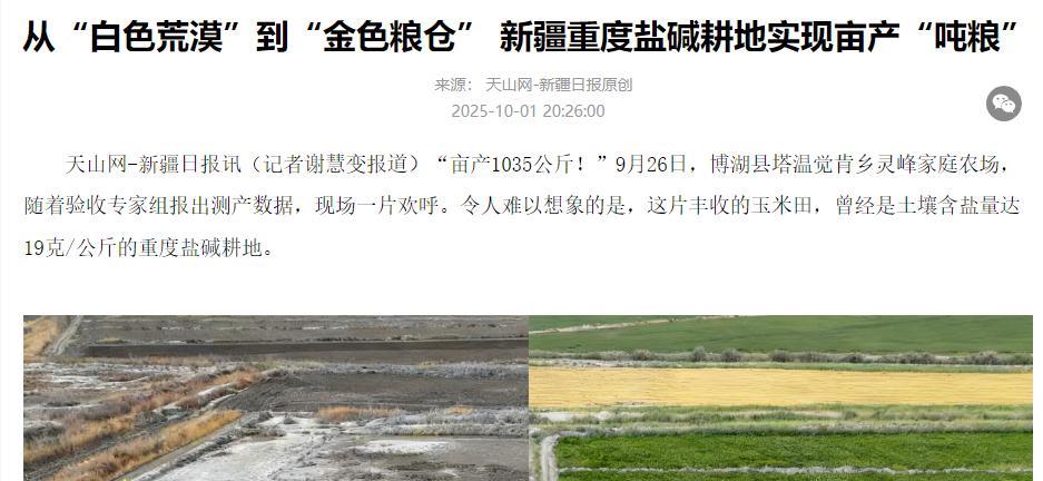 中国又创造了一大“生命奇迹”! 谁能想到,曾被中外专家断言“寸草不生、人畜难存”的新疆盐碱地与沙漠,如今竟变成了稻浪翻滚、棉朵如雪的丰收沃土。 2025年金秋时节,这片总面积超166万平方公里的土地上,正上演着震撼世界的农业传奇,用实打实的收成打破了“生命禁区”的魔咒。这可不是凭空出现的奇迹,而是科研人员和当地劳动人民一起,耗时十多年一点点干出来的,每一分收获都浸透着智慧和汗水。 十年前的新疆,盐碱地占了全区耕地的近三分之一,在那些盐碱特别重的地方,连在沙漠里都能扎根的骆驼刺都活不下去。塔克拉玛干沙漠边上的农户回忆,那时候种小麦,一亩地收不上一百斤,有时候播下十斤种子,最后能收回五斤就谢天谢地了。 就在大家以为这片土地再也没有希望的时候,转机出现了——2014年国家启动了“盐碱地综合治理工程”,农业农村部拉着中科院的专家组成专项团队,带着各种仪器设备直接扎进了这片不毛之地。 他们没有照搬国外的法子,因为知道新疆“干旱少雨、蒸发又快”的气候很特殊,专门研发出“生物改良+膜下滴灌”的搭配技术。 先种上苜蓿这种耐盐碱的植物,让土壤结构慢慢变好,再铺下智能滴灌带,精准地控制浇水和施肥的量,这样既能减少水分蒸发,又能把土壤里的盐分慢慢降下来。 功夫不负有心人,农业农村部2025年的最新数据显示,新疆已经累计治理了1200万亩盐碱地,其中800万亩达到了耕地标准,光是新增的粮食产能就超过80亿公斤,够上千万人吃一年。 在南疆喀什地区,以前白茫茫一片的盐碱地,现在种上了耐盐碱水稻,一亩地能收550多公斤,这多亏了中科院新疆生态与地理研究所培育的“新稻18号”品种,它能在盐分0.6%的土壤里生长,比普通水稻能耐受的0.3%盐分高出一倍。 而在北疆石河子,盐碱地棉田采用“棉花和小麦轮流种”的模式,一亩地能收420公斤籽棉,和非盐碱地的产量一样高。 更让人高兴的是,这些改良后的土地还特别省水,滴灌技术让农业用水的利用率从传统漫灌的30%提高到了90%以上,在年降水量不足200毫米的地方,硬是创造了灌溉的奇迹。 这些成绩的背后,是无数人在默默付出。科研人员每年有八个月都待在田间地头,白天测土壤样本、调试设备,晚上就在临时搭建的实验室里分析数据;当地农户也放下老办法,跟着专家认真学技术,慢慢都能熟练操作智能灌溉系统了;政府还投入了超过200亿元,修建配套的水利设施,打通了灌溉的“最后一公里”,让水能够顺利送到每一块田地。 现在,新疆盐碱地治理技术已经形成了一套标准流程,不仅在国内其他地方推广,还吸引了哈萨克斯坦、乌兹别克斯坦等中亚国家的人来学习。 当外国使节看到沙漠边缘一望无际的万亩棉田时,都忍不住感叹:“中国用实践证明,没有真正的生命禁区,只有还没被攻克的难题。” 这片曾经连草都长不好的土地,如今正用沉甸甸的稻穗和雪白的棉朵,向世界展示中国农业的硬实力,也书写着人与自然和谐共生的崭新篇章。