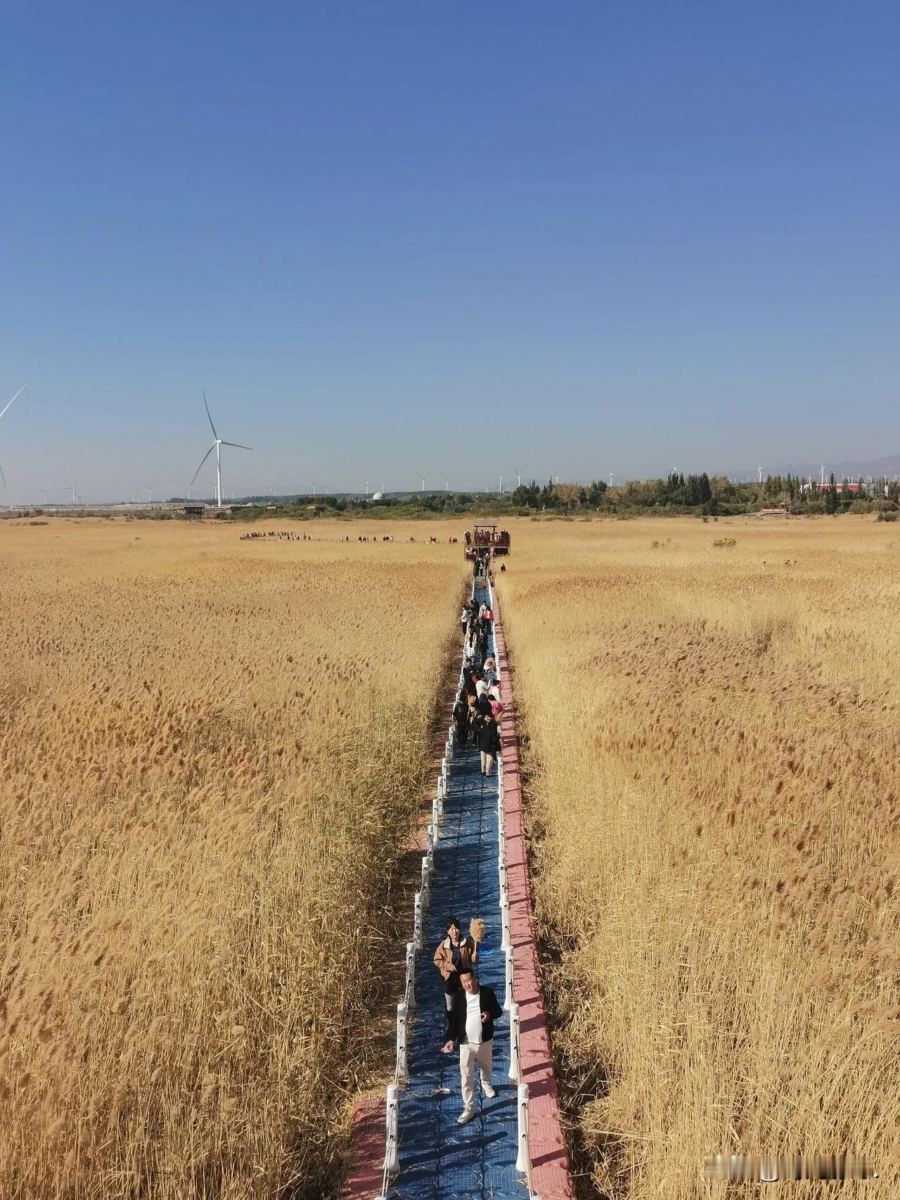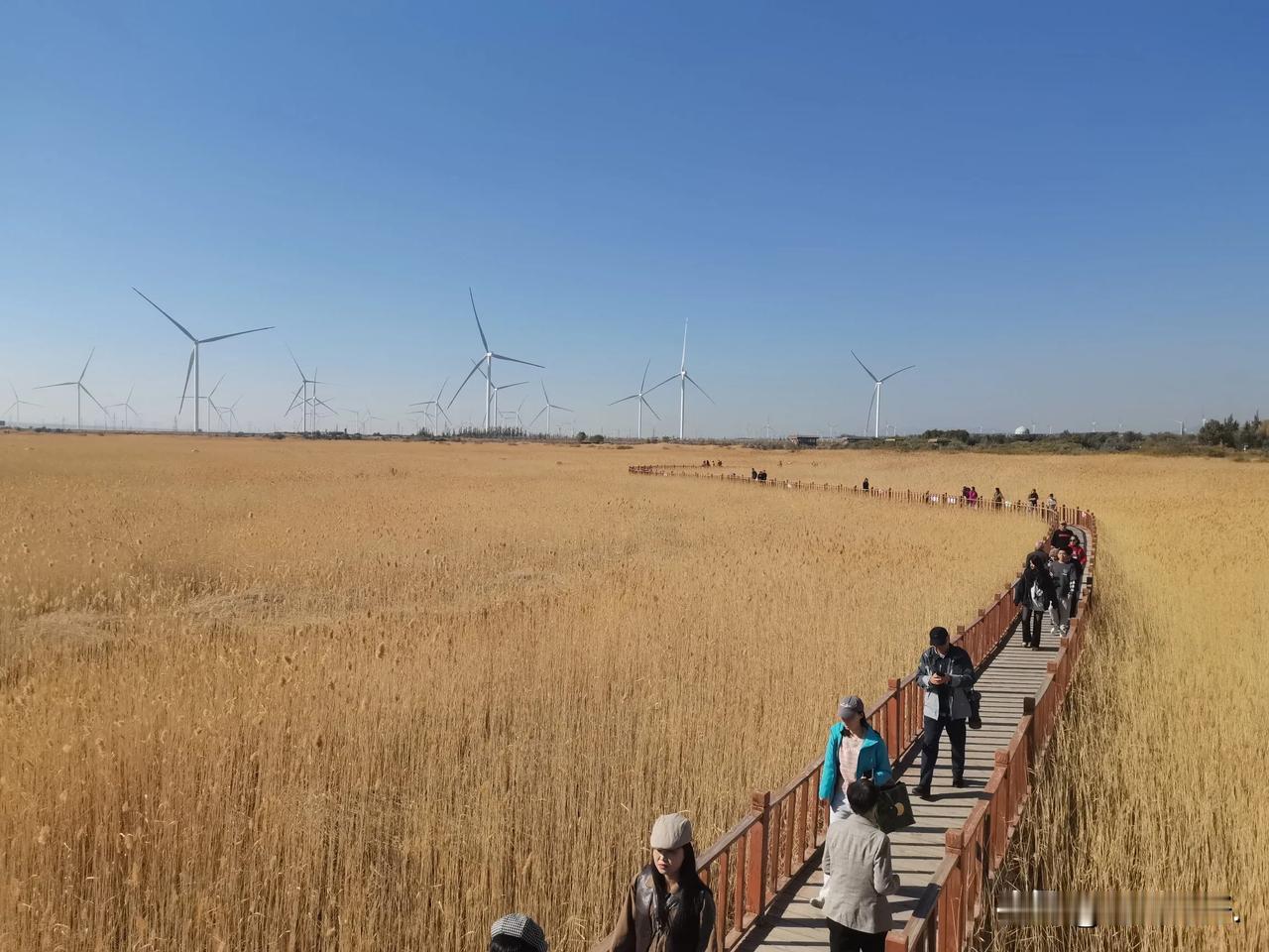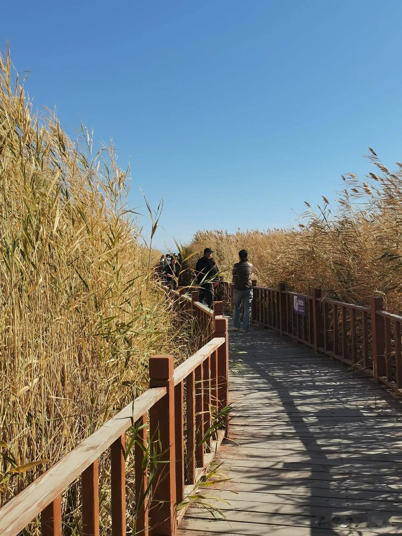 昨天中午,趁着天气好,和家人去了柴窝堡国家湿地公园。 到柴窝堡必得先去吃一顿辣子鸡。不知平时是什么状况,节日期间的“柴窝堡辣子鸡一条街”路两边的车停得满满当当。几乎每家店里都是热热闹闹,名气大的饭馆门口还在排队等位。我们也凑个热闹,找了网上评价好店美餐一顿。 柴窝堡国家湿地公园就在辣子鸡一条街旁边,二者相互成就,来吃鸡的人想必也要顺便来公园里转一转。节日期间,8元的公园门票还打八折,游人络绎不绝。 金秋10月,湿地公园一片金色,放眼望去,茂密的芦苇荡像丰收的麦田。木栈道在芦苇丛中延伸 ,毛茸茸的芦苇花在风中摇曳。 顺着木栈道走在芦苇荡深处,身边一人多高的芦苇丛密密匝匝的好像一面墙。不由得想起《黄河大合唱》中“青纱帐里游击健儿逞英豪”,这浓密的芦苇丛就像那掩护游击队员的天然屏障。 景区里有观鸟台,还有许多保护鸟类的提示牌,但却没有见到鸟 。也许是这个季节鸟儿们已经迁徙了。 秋日暖阳里,来这里走走路、晒晒太阳也是不错的选择。