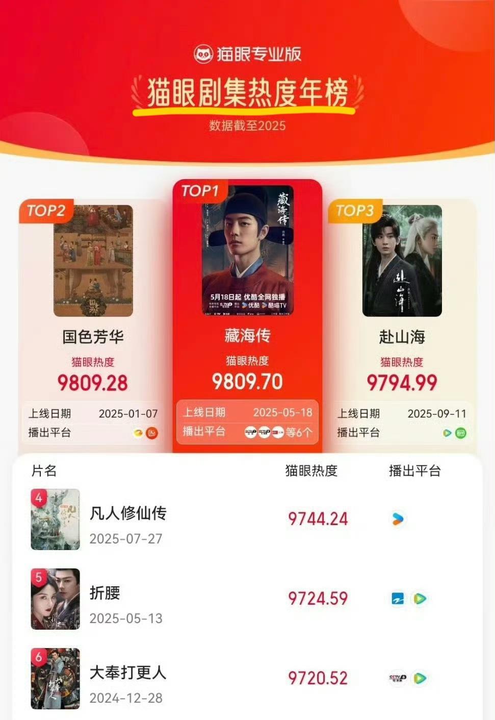 肖战和成毅,谁才是25年猫眼热度第一? 今天我一上网,就看见这两张图,左图说成毅的《赴山海》是25年猫眼热度第一,右图说肖战的《藏海传》是25年热度第一。 这第一怎么可能有两个呢? 于是我仔细看了一下,原来图一是网剧的排行榜,《藏海传》《国色芳华》《生万物》这种上星剧是不在这个范围里的。 而右图是把所有电视剧,包括上星剧和网剧全部汇总在一起的,所以第一是肖战的《藏海传》,第二是杨紫的《国色芳华》,成毅的《赴山海》虽然能在网剧里面拿第一,但是在总榜是排第三的。 当然,也有宝宝问,我记得《折腰》也上过卫视播出啊,为啥也在网剧榜单? 这里要给大家科普一下,只有第一次开播当日,网络和上星同天播,才算上星剧,如果是网络上已经播了半个月一个月之后再上星,后面也只会列入网剧。 《折腰》这种开播是在腾讯独播,播了一段时间才上星的,在年底各大榜单都会列入网剧。 最后我想说,现在才10月,到年底还有两个月呢,没必要现在就吹谁是第一,说不定最后两个月还有黑马呢,我们不如等到12月再看[星星眼] #肖战# #成毅#