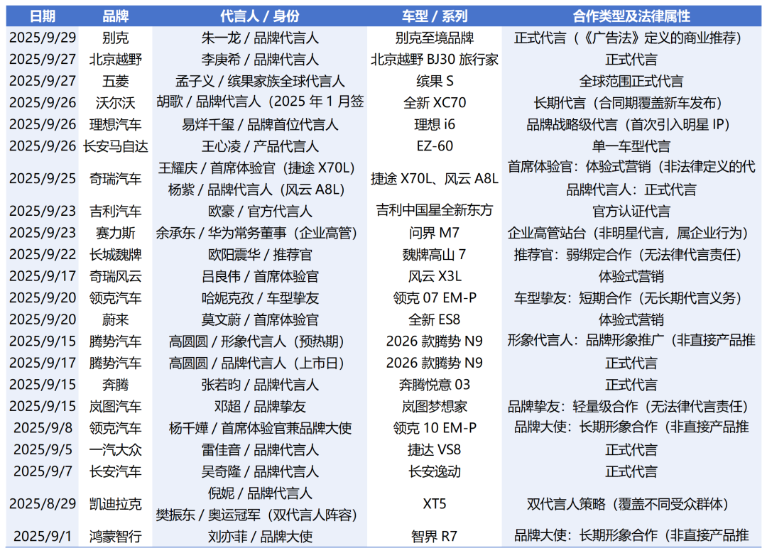 翻开9月的车圈代言清单,活像在看一份“文体圈顶流通讯录”——从豪华品牌到国民车企,从实力派演员到体坛冠军,几乎把不同圈层的受众“一网打尽”。