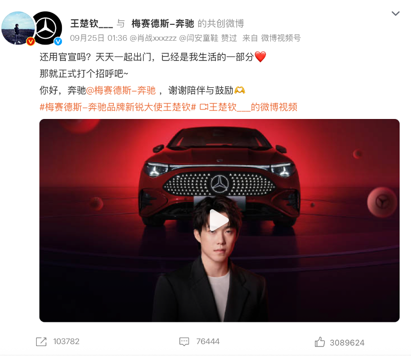 合作模式也从“长期绑定”变成“短平快精准打击”。十年前车企签明星,动辄三五年长约、千万级代言费,现在更倾向“单次活动+细分车型”:小鹏全新P7上市时,一口气找了钟楚曦、朱正廷、宁泽涛、陈妍希四位明星,钟楚曦以车主身份当“时尚代言人”,其他人则对应不同配色车型,覆盖不同受众;理想请易烊千玺,也主要围绕纯电SUVi6的上市周期,聚焦年轻市场;就连奔驰找王楚钦,也是为了配合全新纯电CLA的推广——这种“短期合作”不仅降低成本,还能避免“明星塌房”的长期风险。