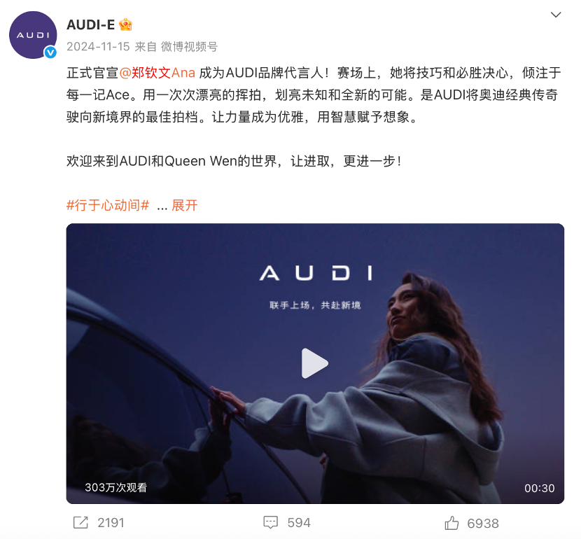 豪华品牌率先“发力”,奔驰找来“国乒顶流”王楚钦当新锐大使,青春活力的冠军形象刚好匹配全新纯电CLA;沃尔沃邀胡歌出席全新XC70发布会,沉稳气质和品牌调性完美契合;奥迪更直接,让网球名将郑钦文为新品牌AUDI站台,国际范儿拉满。