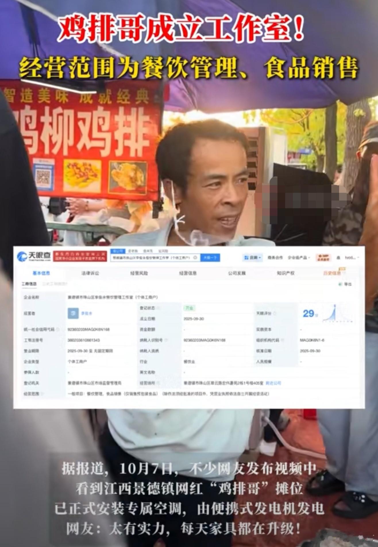 鸡排哥成立工作室给摊位安上了空调,还成立了工作室,这节奏是要做大做强啊,景德镇旅游鸡排哥都是一个打卡点,不得不说这真的牛