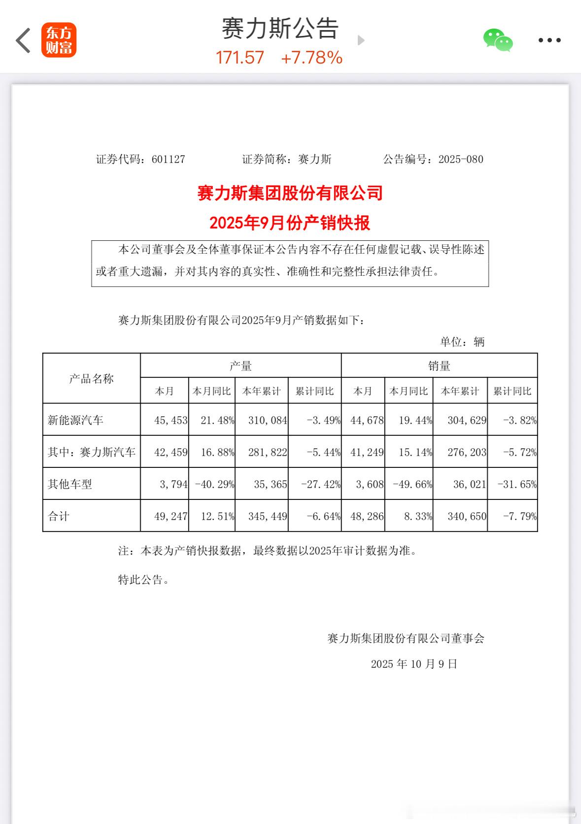 赛力斯9月新能源车销量4.47万辆【赛力斯:9月新能源汽车销量同比增19.44%】财联社10月8日电,赛力斯(601127.SH)公告称,2025年9月新能源汽车销量达到4.47万辆,同比增长19.44%。