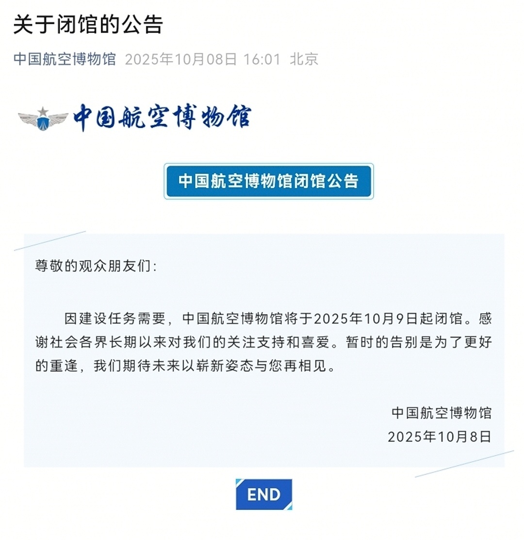 因建设任务需要,中国航空博物馆将于2025年10月9日起闭馆。​​​