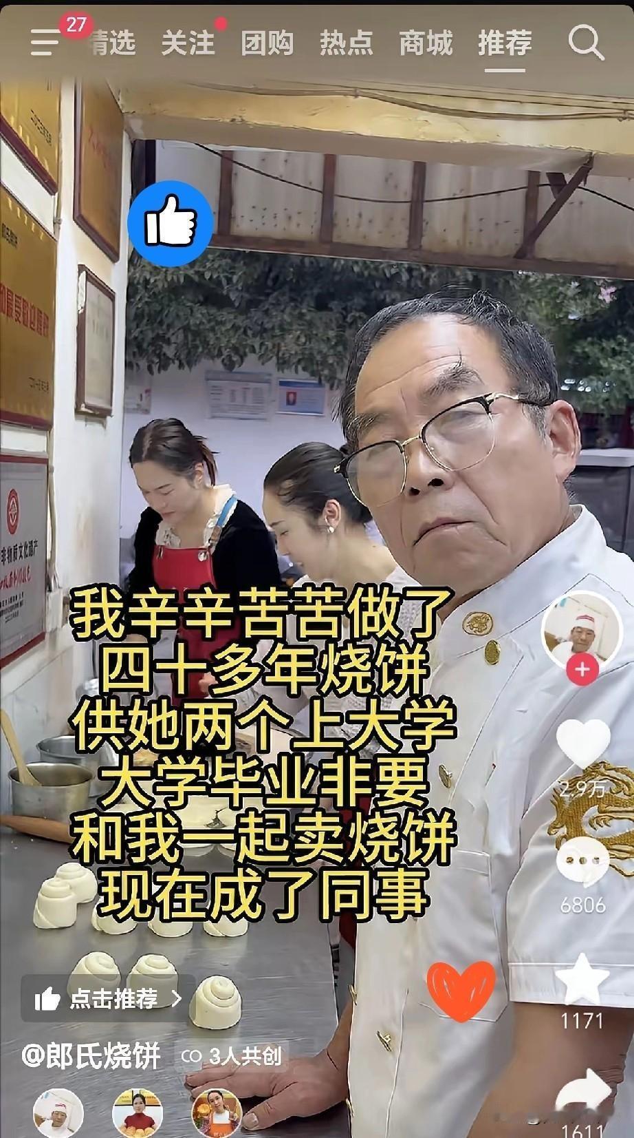 刷到一个让人思考的视频:一位卖烧饼40年的大爷,辛苦供养两个女儿读完大学。本以为她们会追求所谓的“体面工作”,却意外选择回家帮父亲一起做烧饼。大爷的表情,夹杂着欣慰和复杂,让人忍不住感慨:不一样的人生选择,谁说不是一种成功? 生活从不只是奔着光鲜的目标奔跑,有时回归平凡也是一种智慧。没有996的压力,没有房贷的负担,和家人在一起经营自己的小事业,未必不比那些“高大上”的职位来得踏实和真实。毕业之后,选择怎样的人生,是“妥协”还是“清醒”?或许答案早已在他们的生活里悄悄浮现。